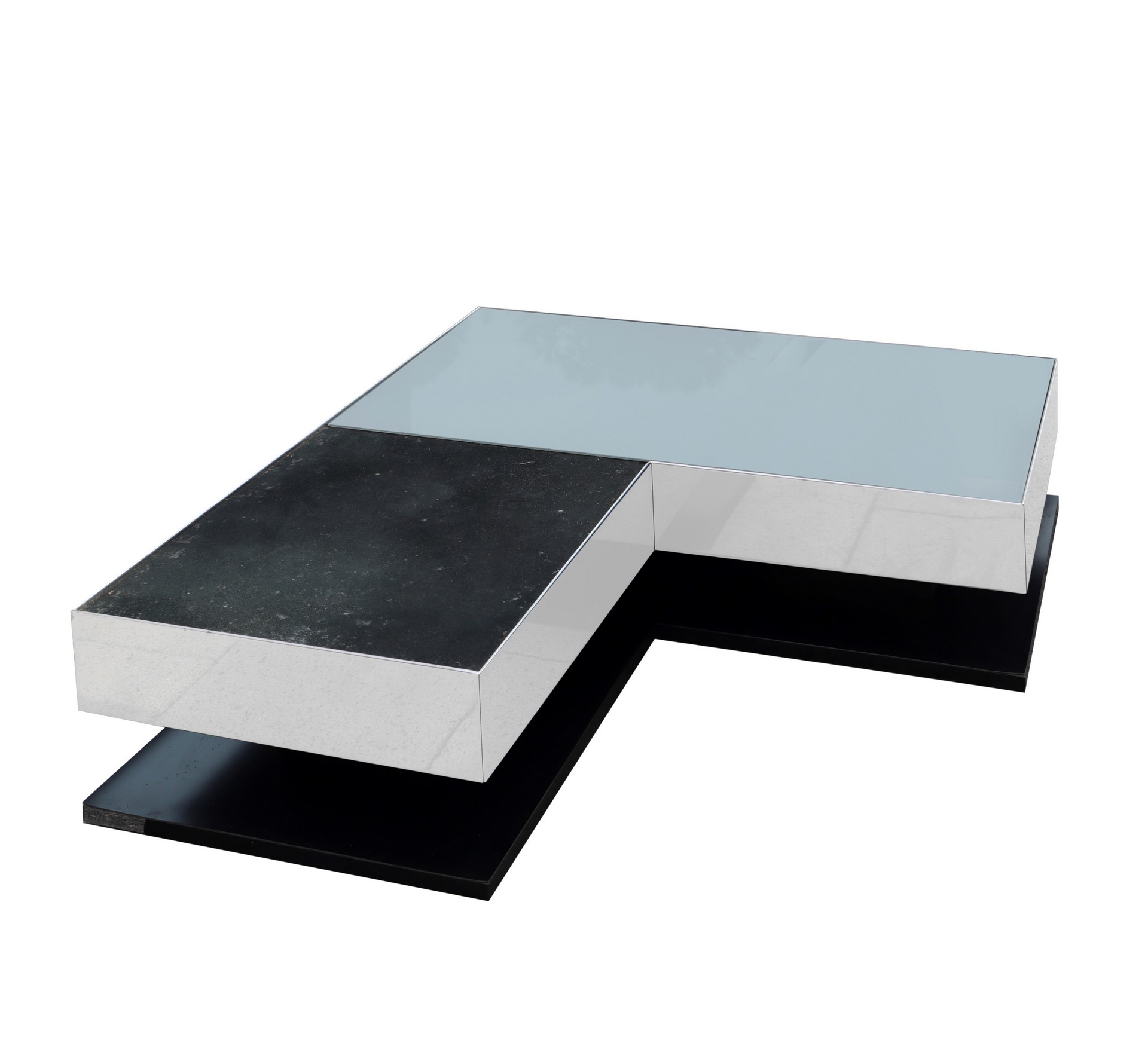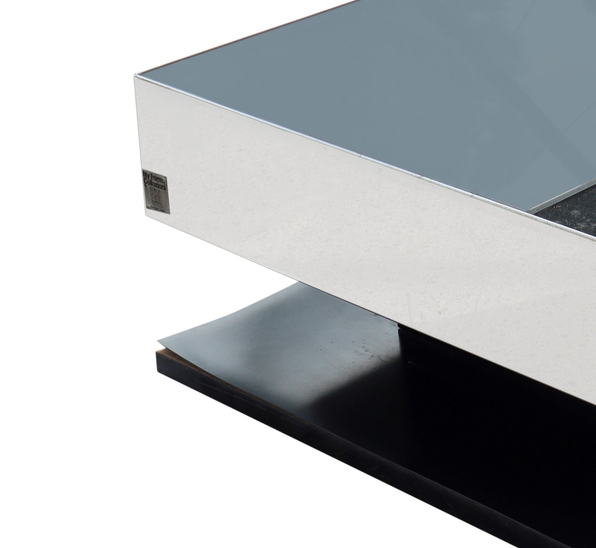 Gianni Ausenda per NyForm - Tavolo da caffè, 1960s h cm 23 x 80 x 80 Produzione NyForm, disegno Gianni Ausenda. Struttura in legno rivestito in formica nera e metallo cromato. Piano rivestito in specchio nei toni del fume'. Manzanza di uno specchio, graffi alla superficie, segni di ossidazione.Produzione NyForm, disegno Gianni Ausenda. Struttura in legno rivestito in formica nera e metallo cromato. Piano rivestito in specchio nei toni del fume'. Manzanza di uno specchio, graffi alla superficie, segni di ossidazione.