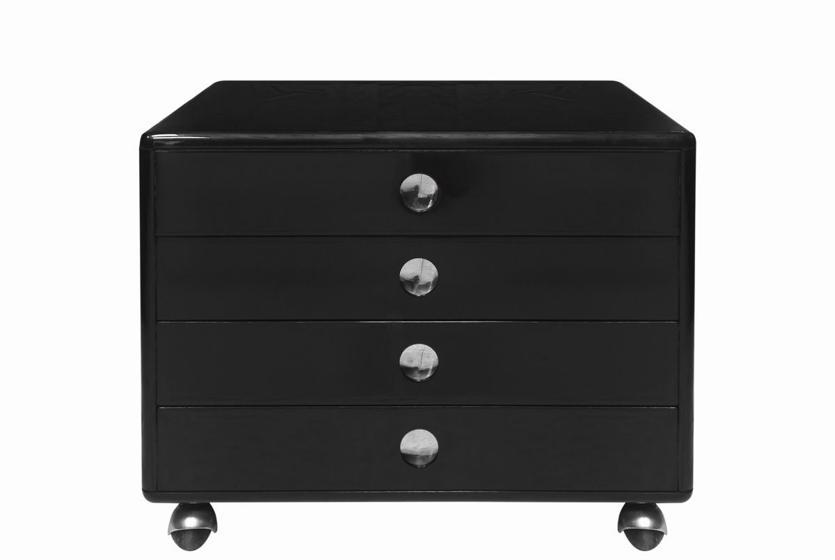 Eugenio Gerli per Tecno - Cassettiera a quattro cassetti, 1960s h cm 52 x 65 x 50 Disegno Eugenio Gerli. Struttura in legno laccato nei toni del nero. Maniglie ad asola con dettagli in metallo cromato. Ruote alla base. Segni d'uso.Disegno Eugenio Gerli. Struttura in legno laccato nei toni del nero. Maniglie ad asola con dettagli in metallo cromato. Ruote alla base. Segni d'uso.