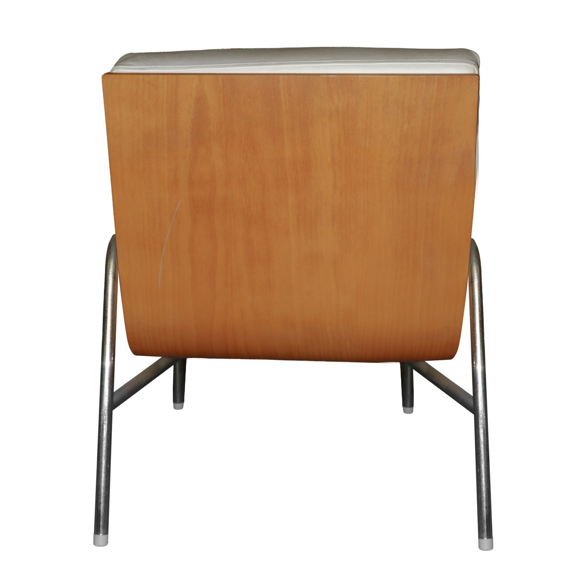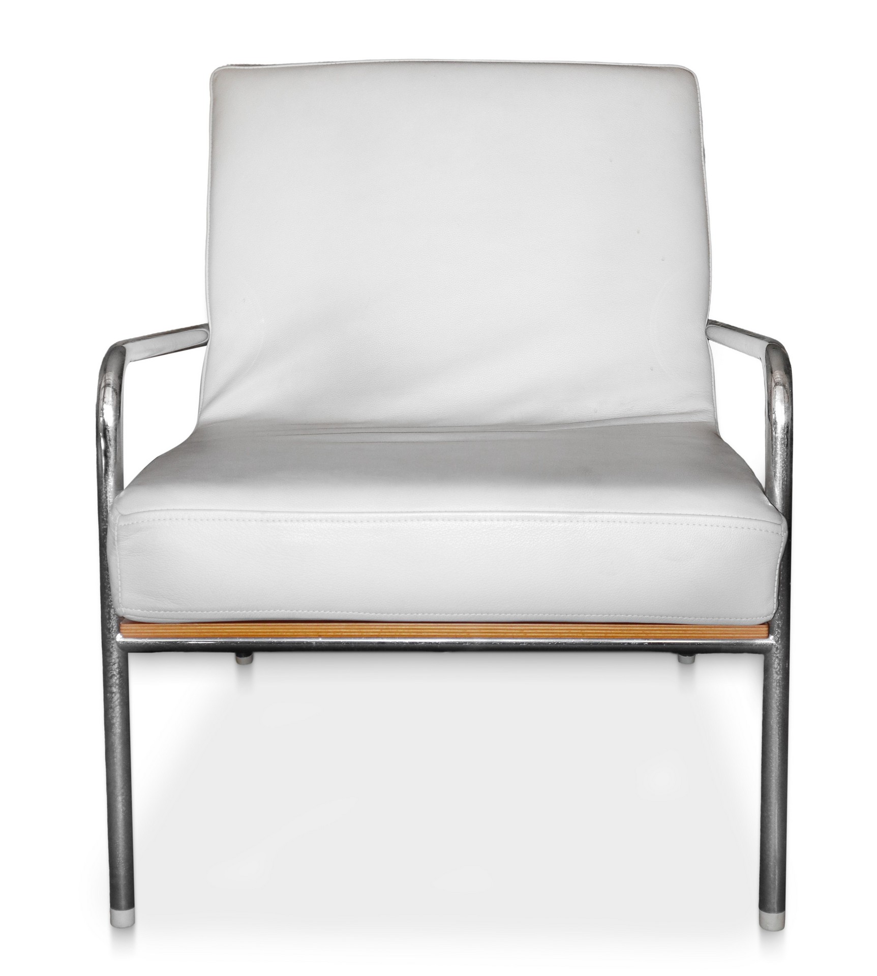 Poltrona prod. italiana Alivar con struttura cromata e tappezzeria in pelle bianca e schienale di sostegno in legno chiaro H cm 83 x 65 x 81
