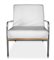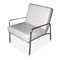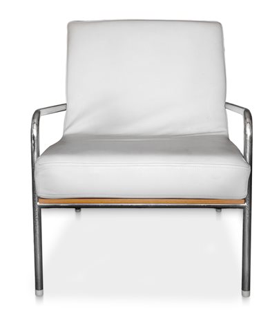 Poltrona prod. italiana Alivar con struttura cromata e tappezzeria in pelle bianca e schienale di sostegno in legno chiaro