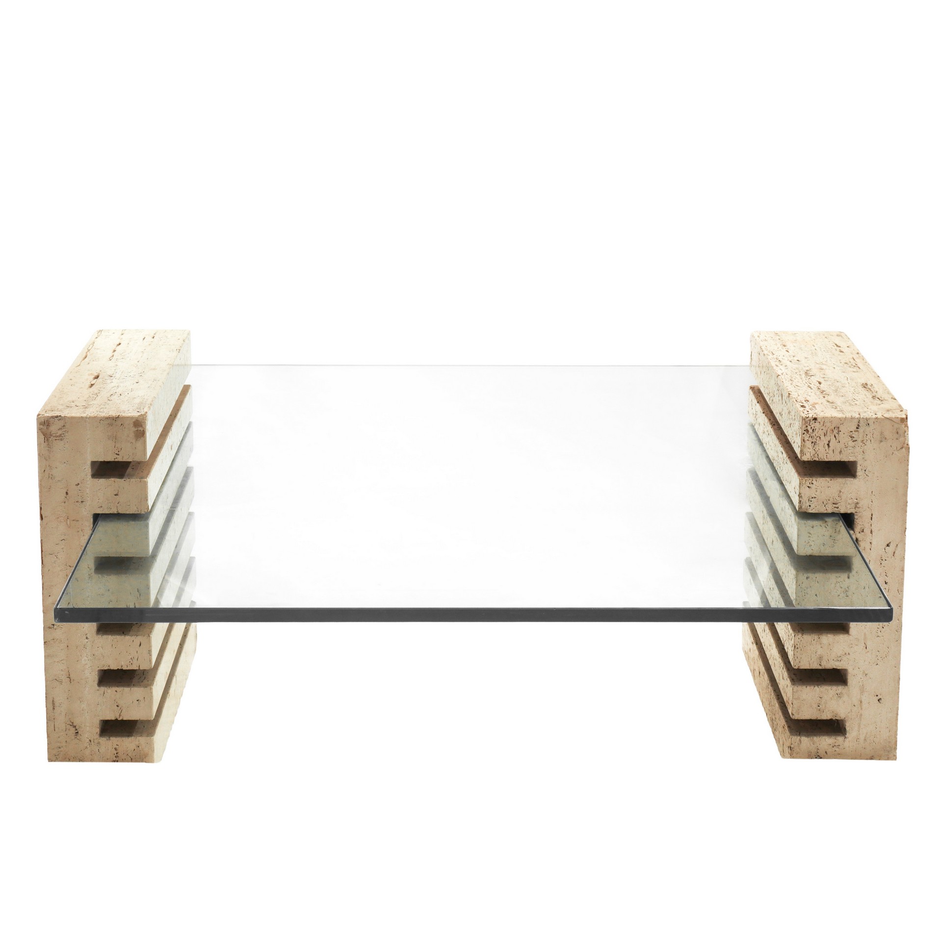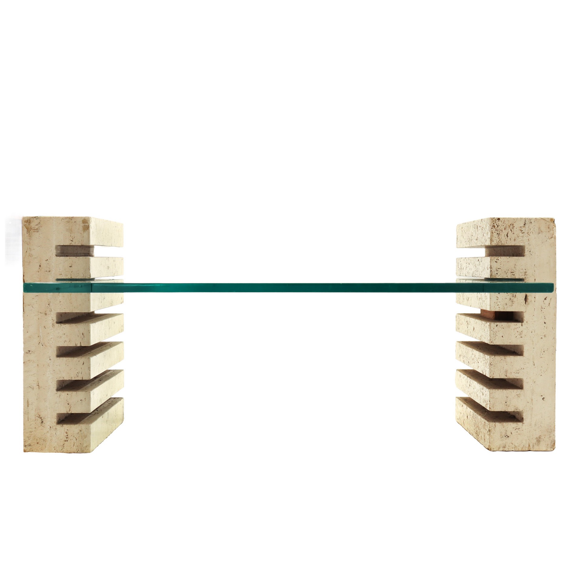 Silvana Bertoldi per Citterio Meda (anni '70) - Tavolino basso in marmo travertino e vetro, 70's h cm 41,5X92,5X80 Piccole rotture e incollature sul marmo Piccole rotture e incollature sul marmo Questo lotto è soggetto a diritto di seguito