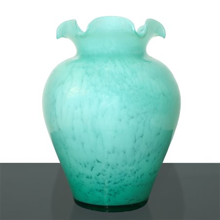 TALEA Studio (Roma 2016) - Vaso in vetro lavorato a mano color verde opalina con bordo collo ondulato H cm 26,5x18 Presente filaturaPresente filatura Questo lotto è soggetto a diritto di seguito