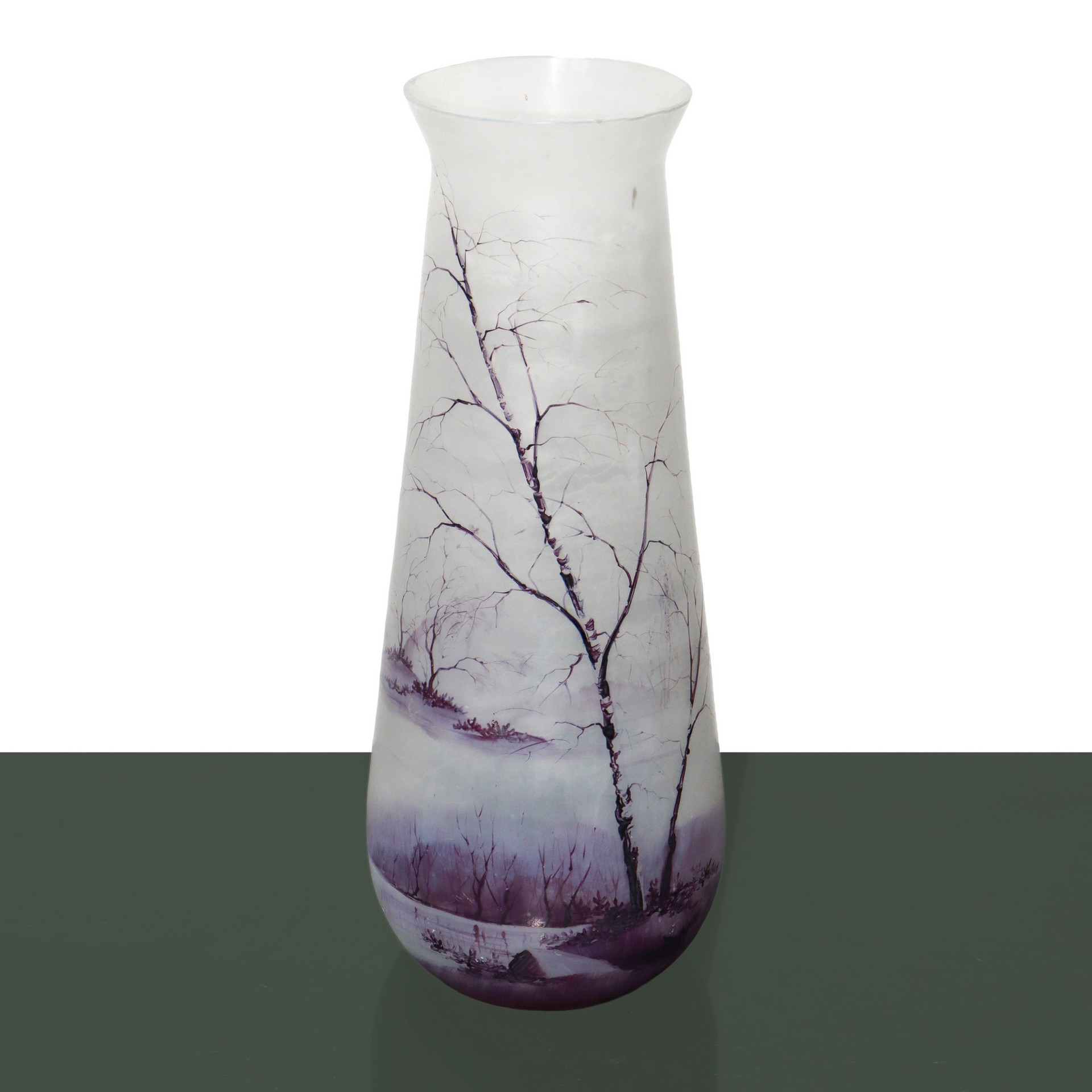 Vaso in vetro satinato, dipinto a smalto a mano con paesaggio, early 20th century