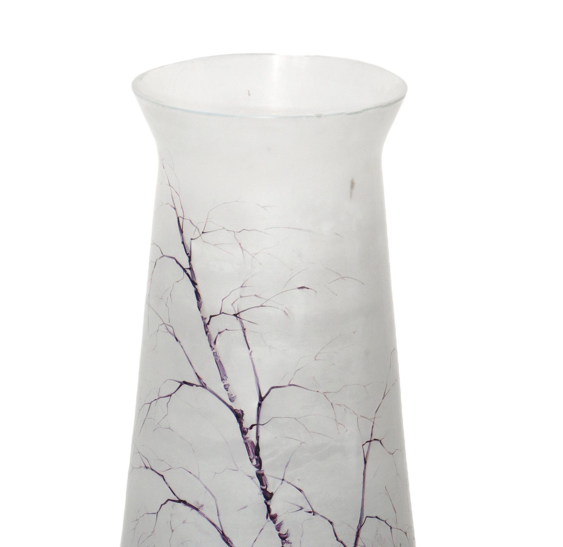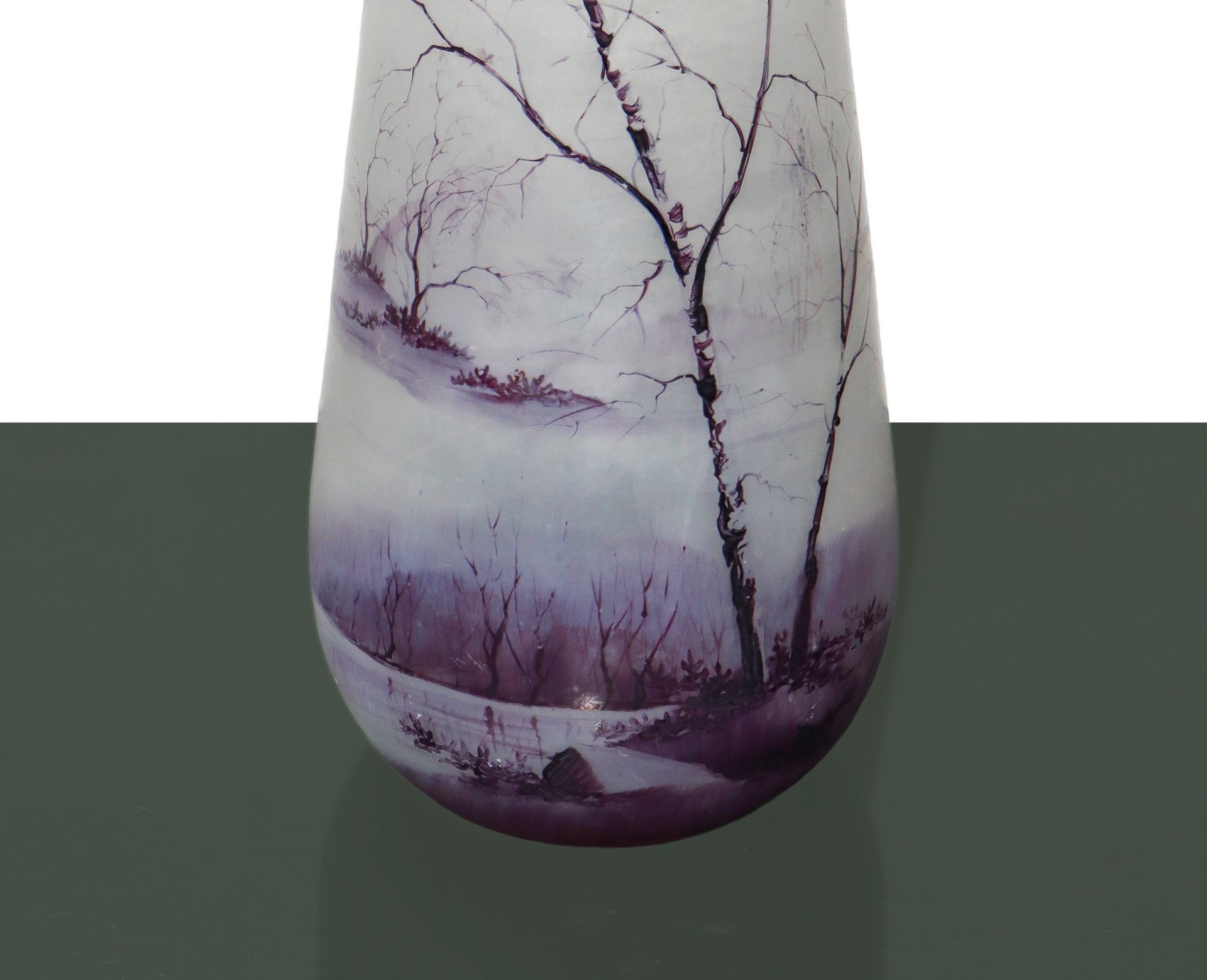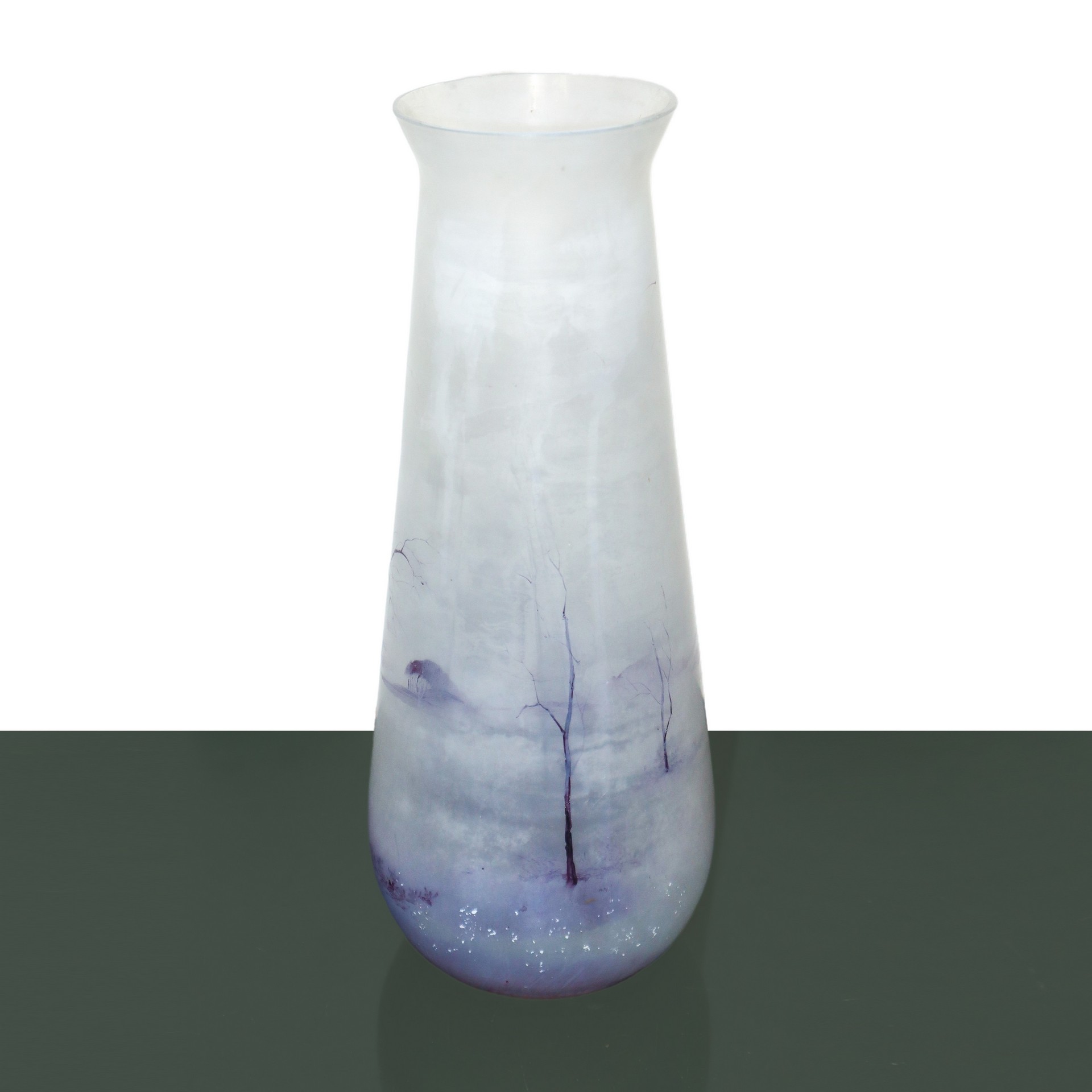 Vaso in vetro satinato, dipinto a smalto a mano con paesaggio, early 20th century H cm 28 x 13 Dipinto nei toni del viola.Dipinto nei toni del viola.