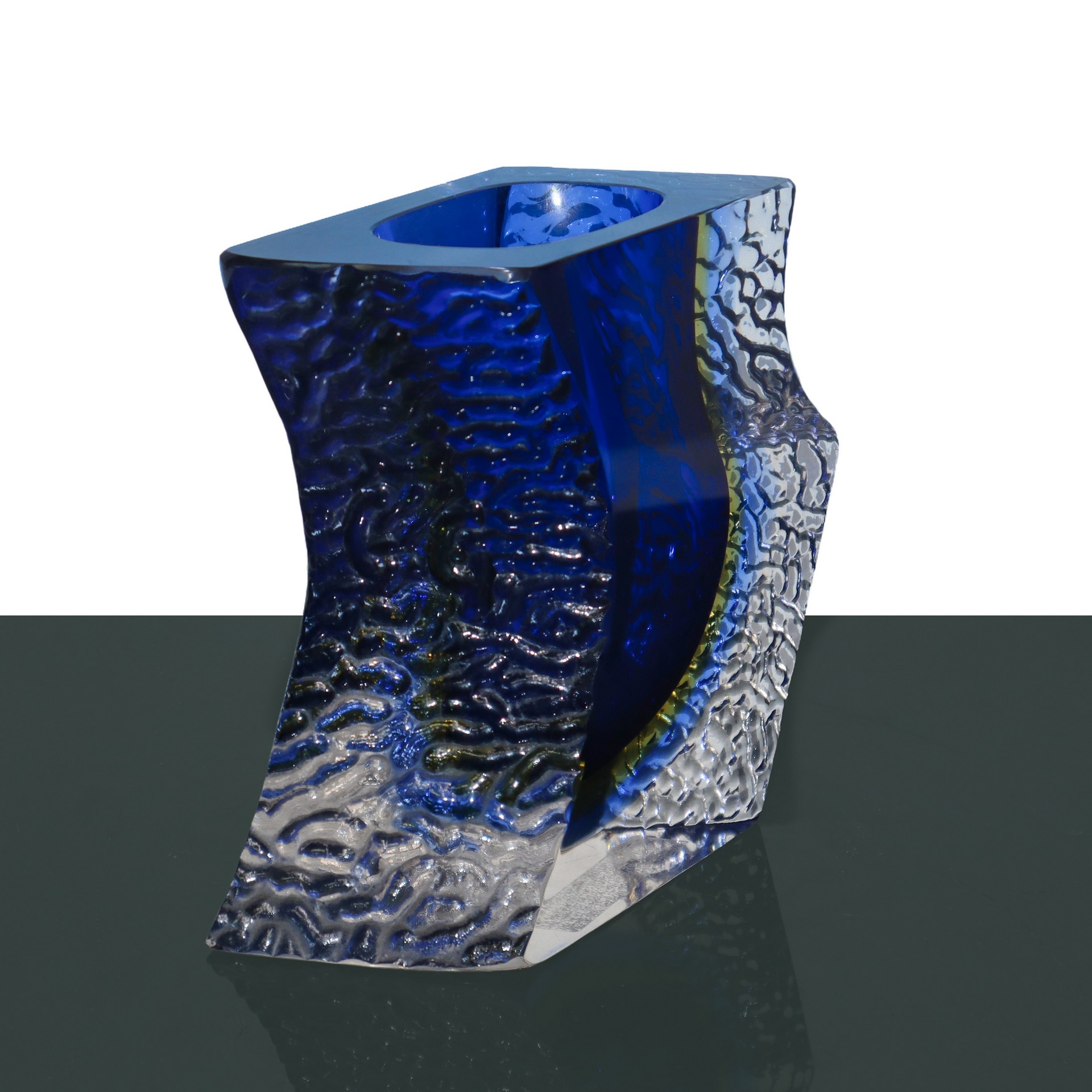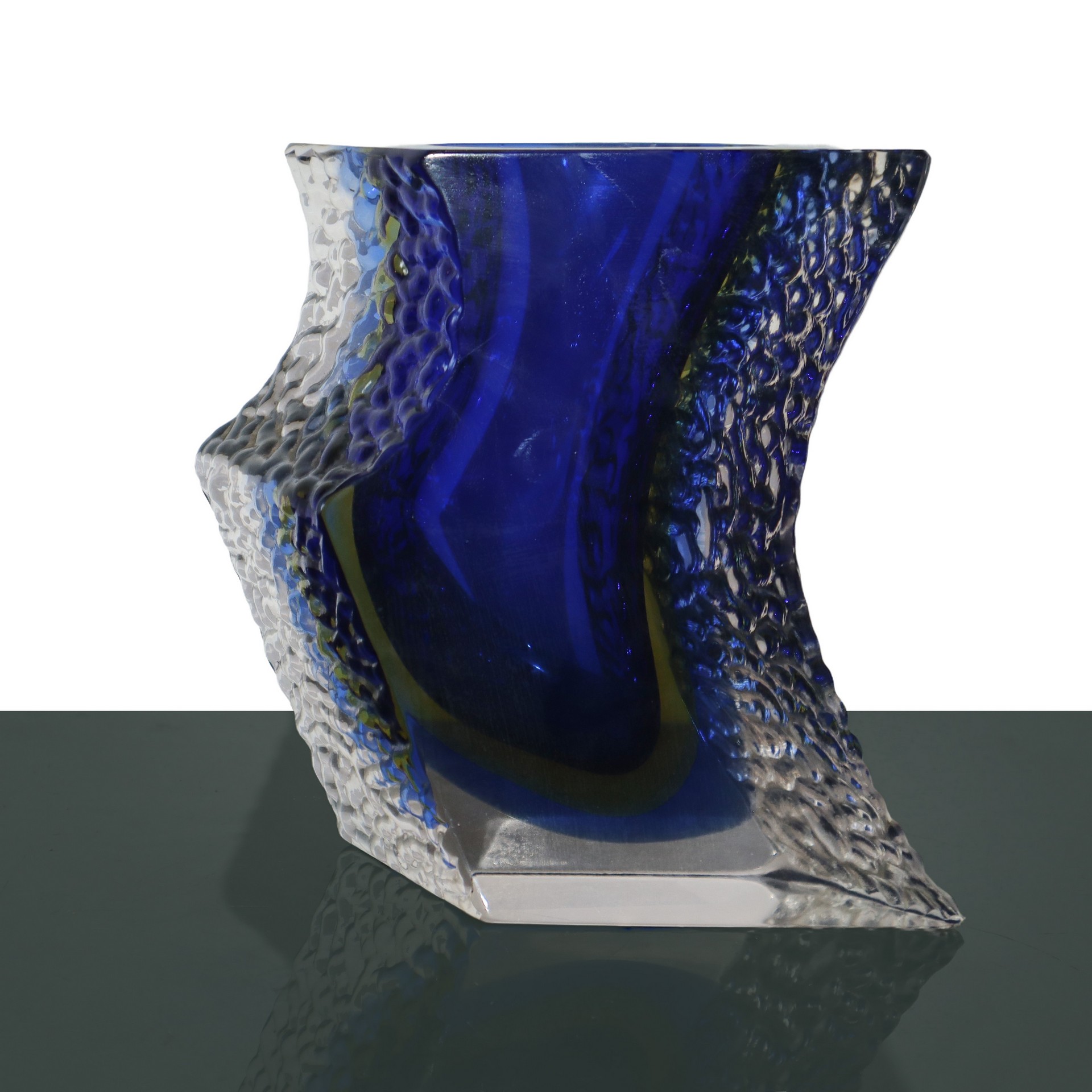 Vaso in vetro sommerso blu con iridescenze interne nei toni del giallo, 20th century