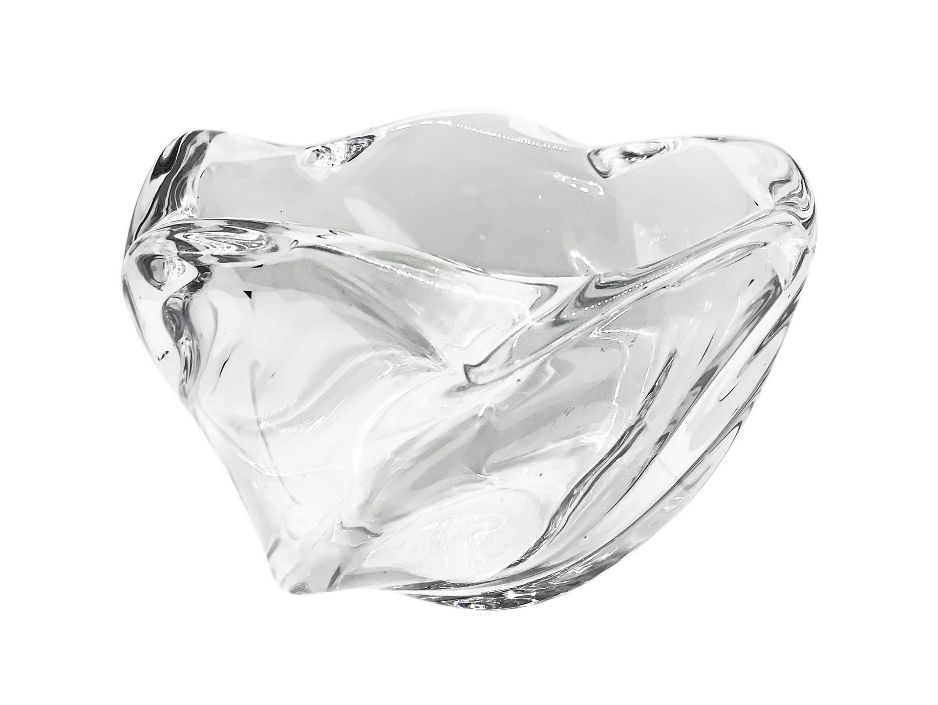 Coppa in vetro trasparente di forma circolare con costolature a rilievo lungo la superfice.