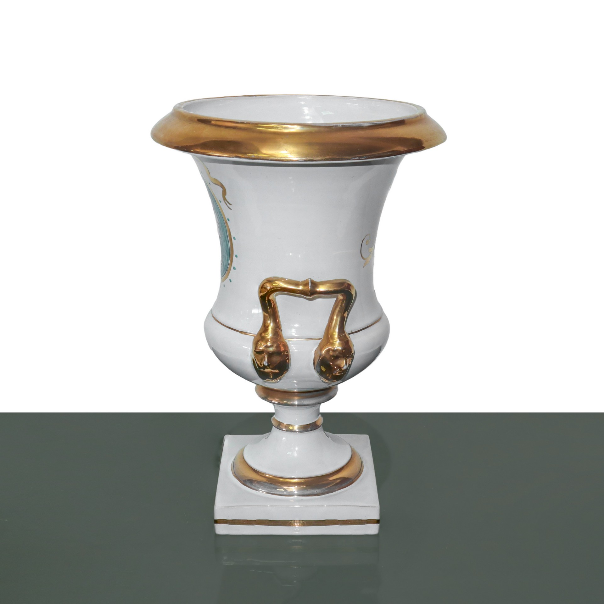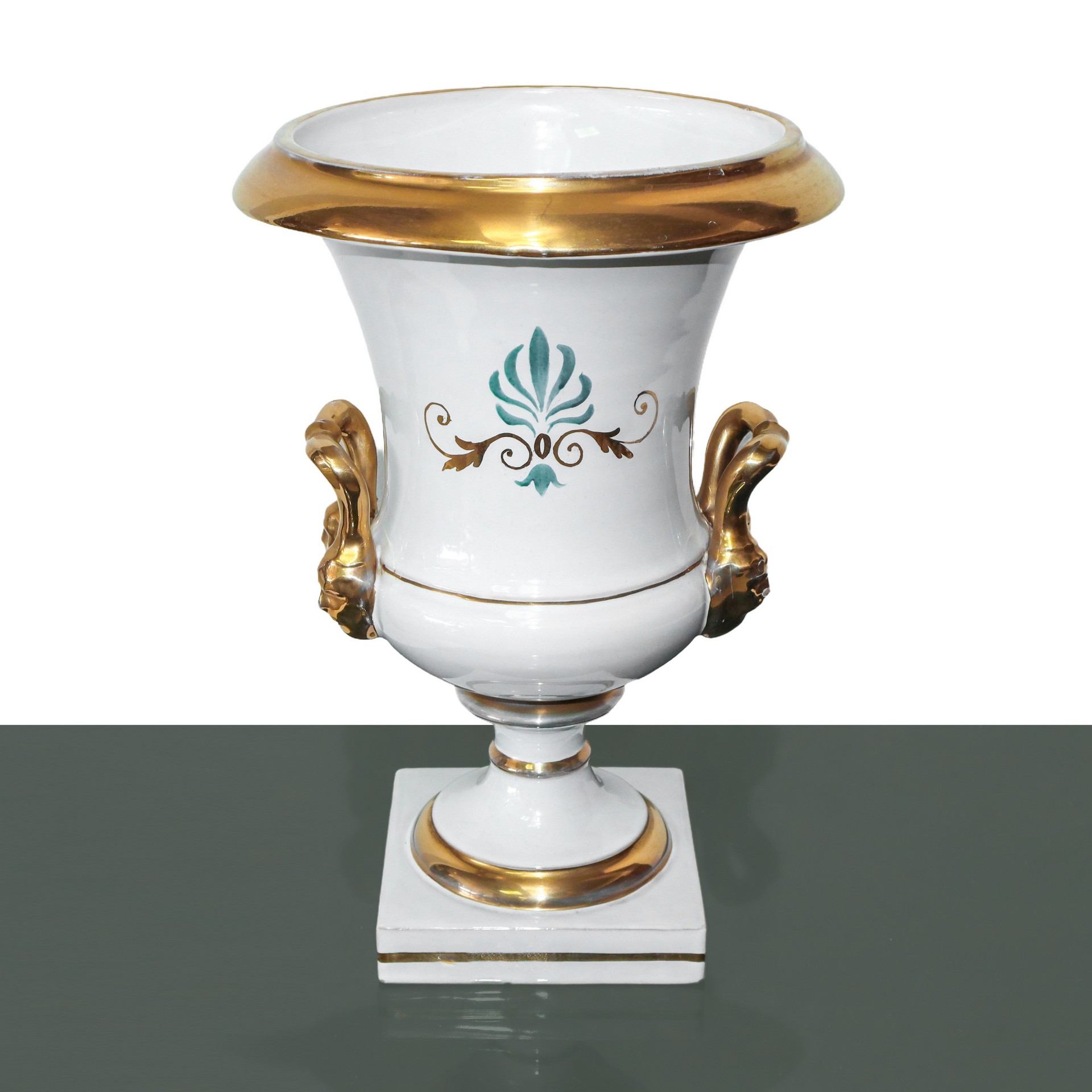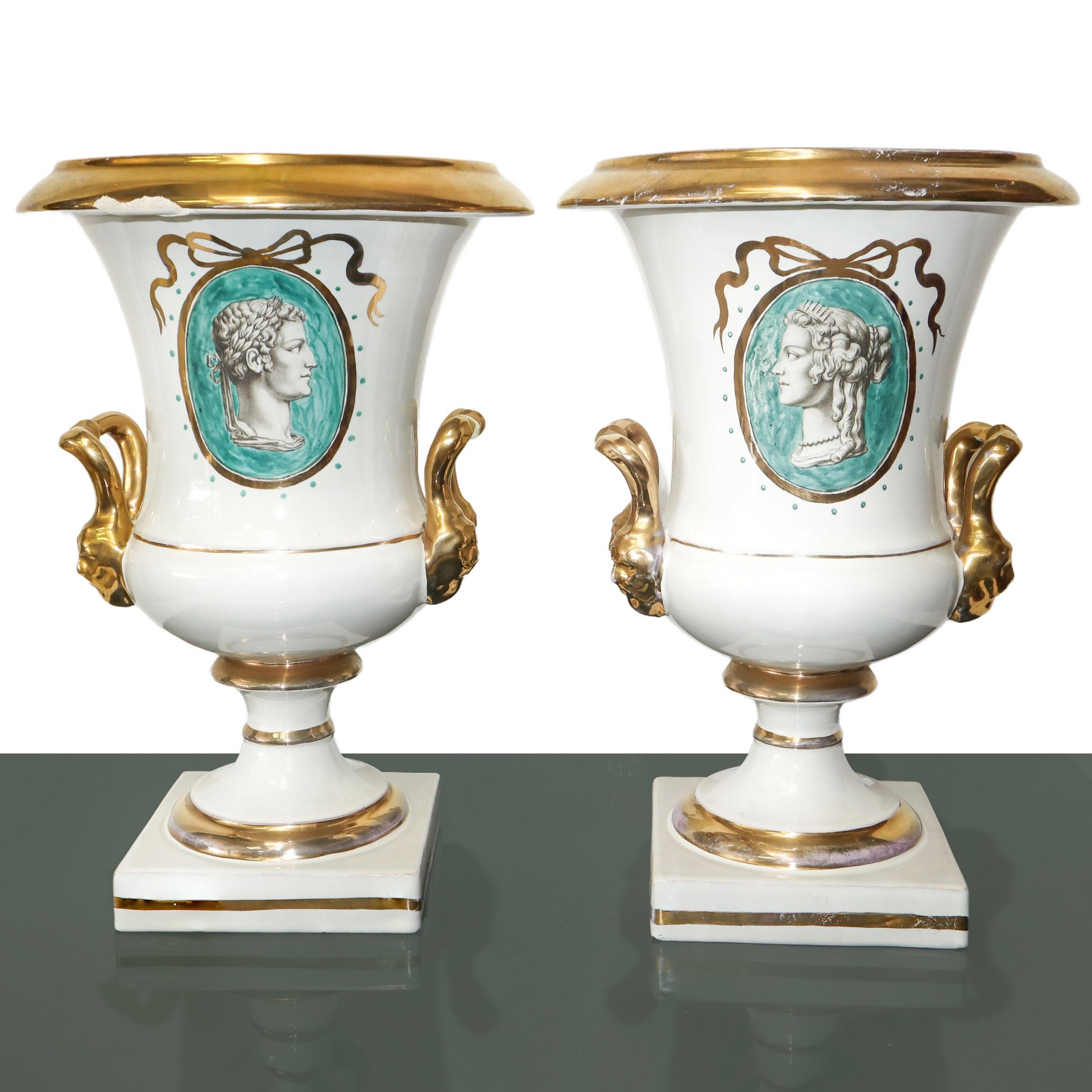 Ugo Zaccagnini&Figli (Sesto Fiorentino 1905 - 2000) - Coppia di vasi a cratere in stile neoclassico con medaglioni con teste anticheggianti con bordi, manici e riporti dorati, 20th century