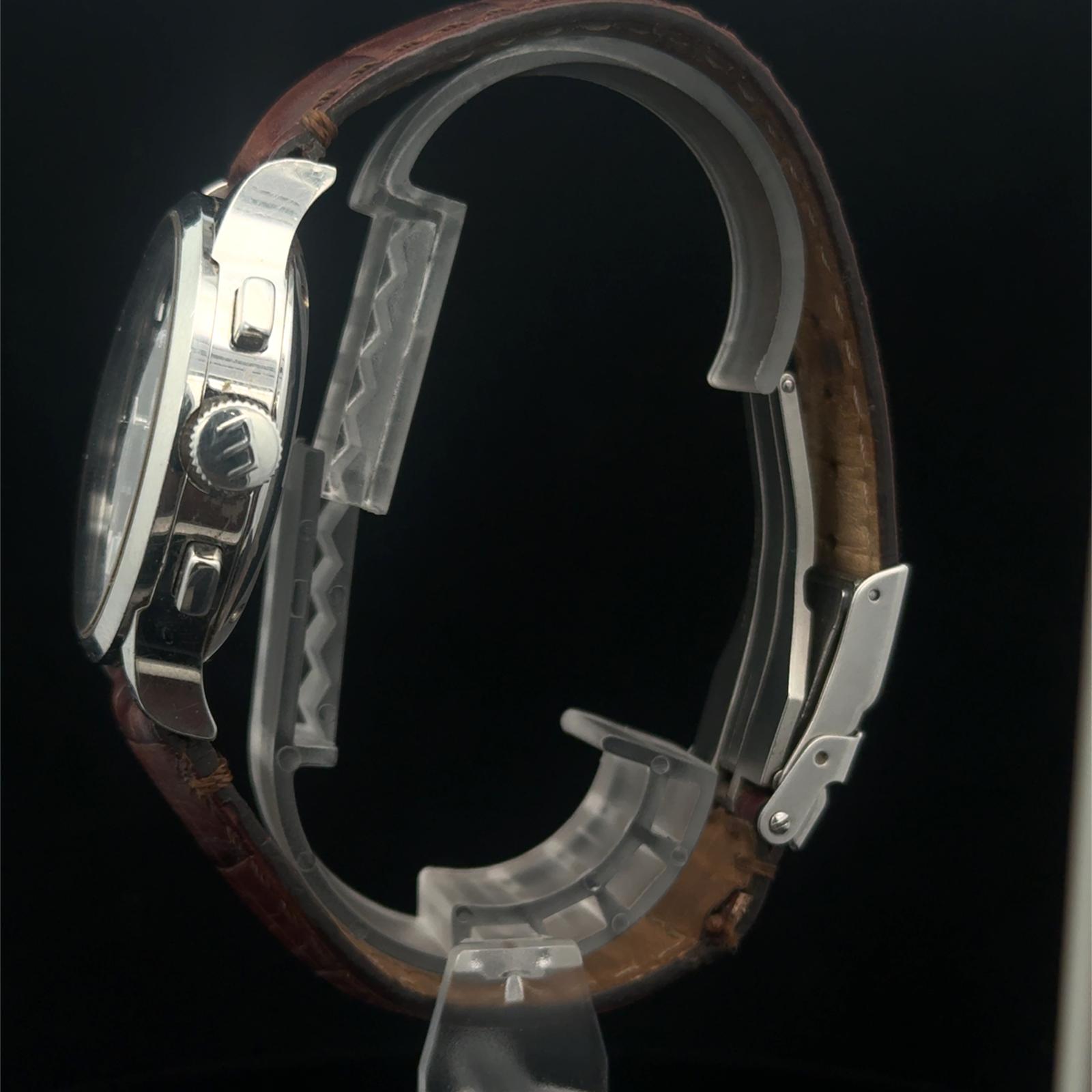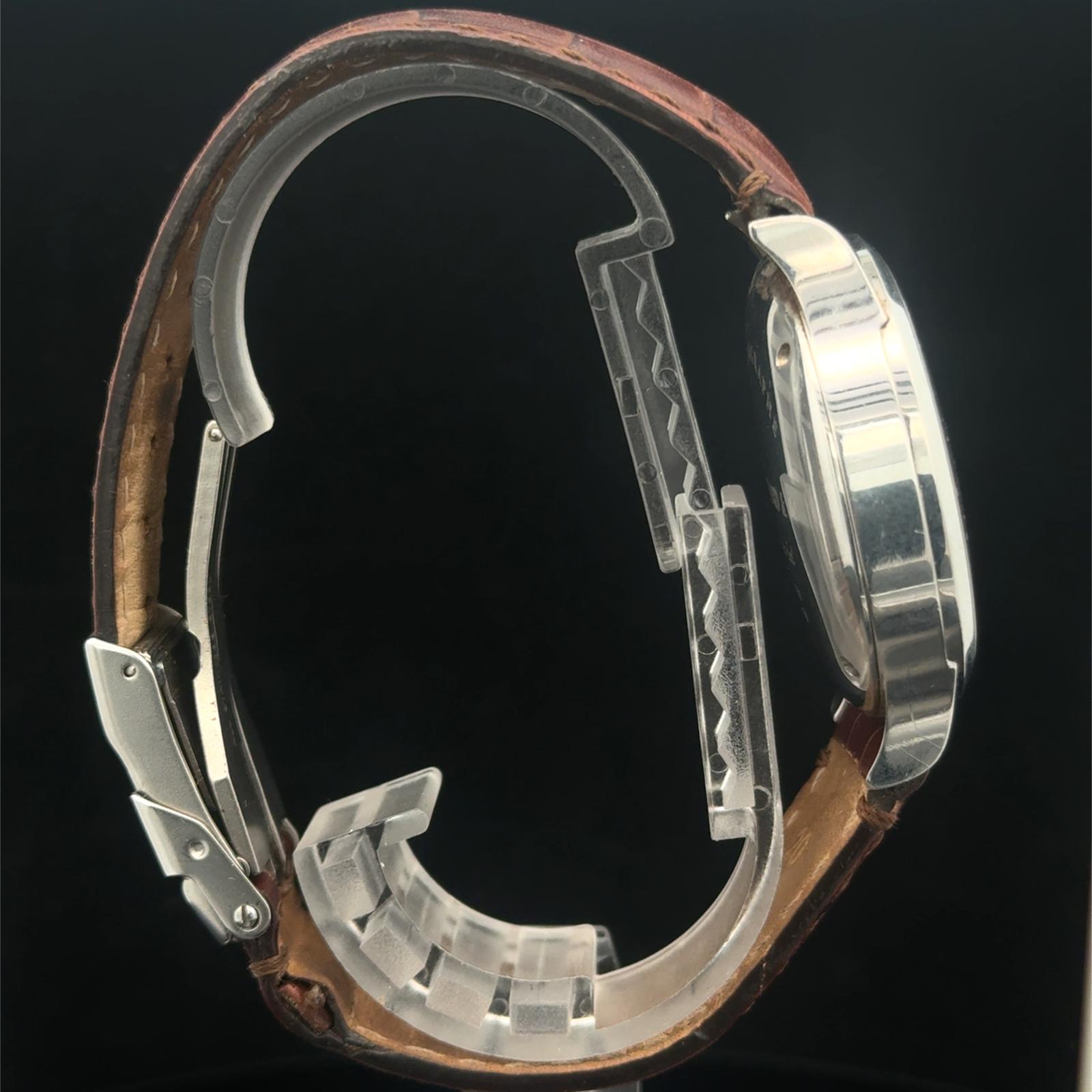 Marca Eberhard & Co. Modello (Orologio) Extra-Fort Numero di referenza 31950 Carica Automatico Materiale della cassa Acciaio Materiale cinturino Pelle Anno di produzione 2001 (Anno approssimativo) L'articolo presenta segni di usura come graffi lievi Corredo Con scatola originale, con documenti originali Carica Automatico Cassa Materiale della cassa Acciaio Diametro 39 mm Quadrante Nero Cinturino Materiale cinturino Pelle Colore cinturino Marrone