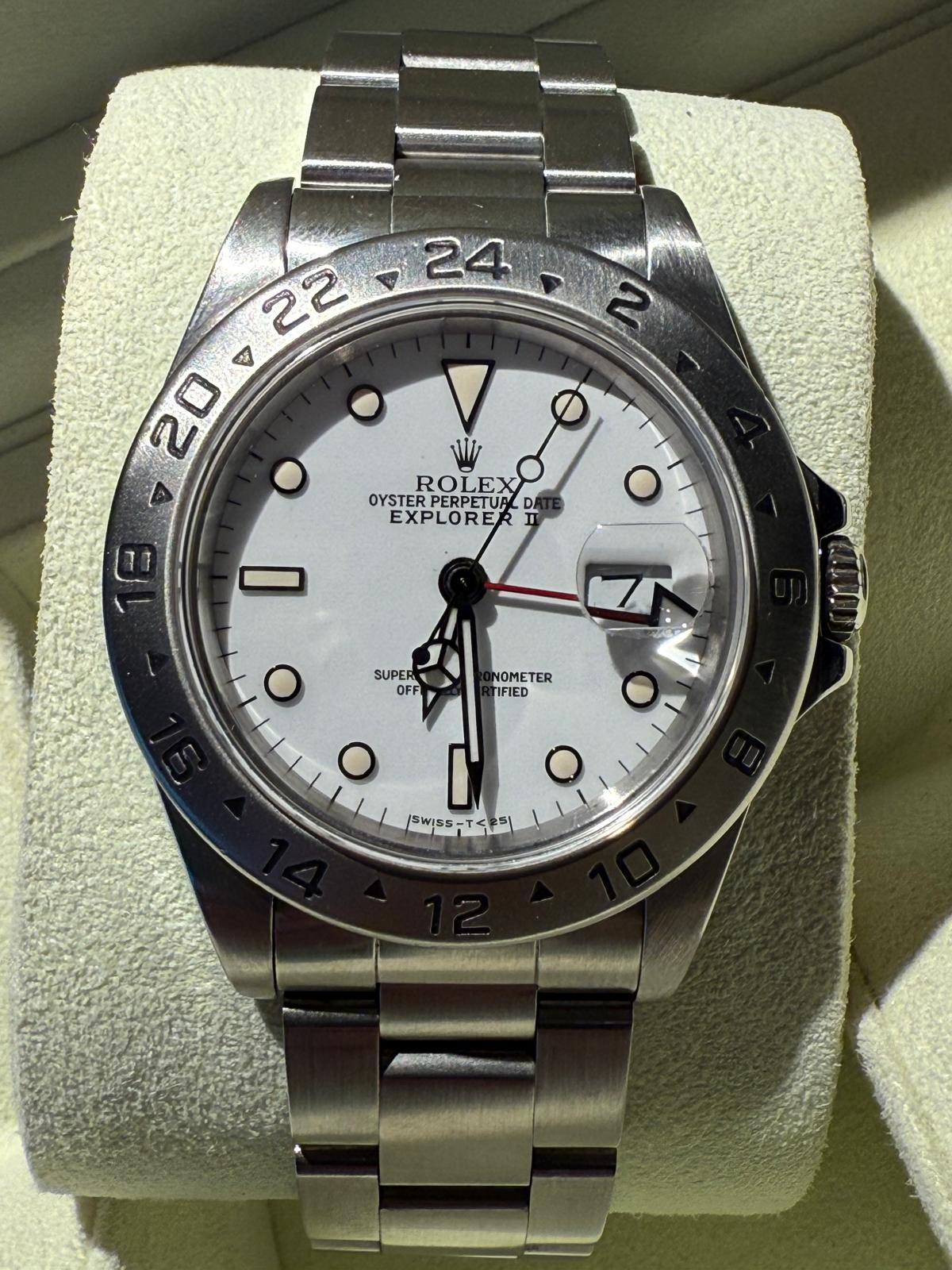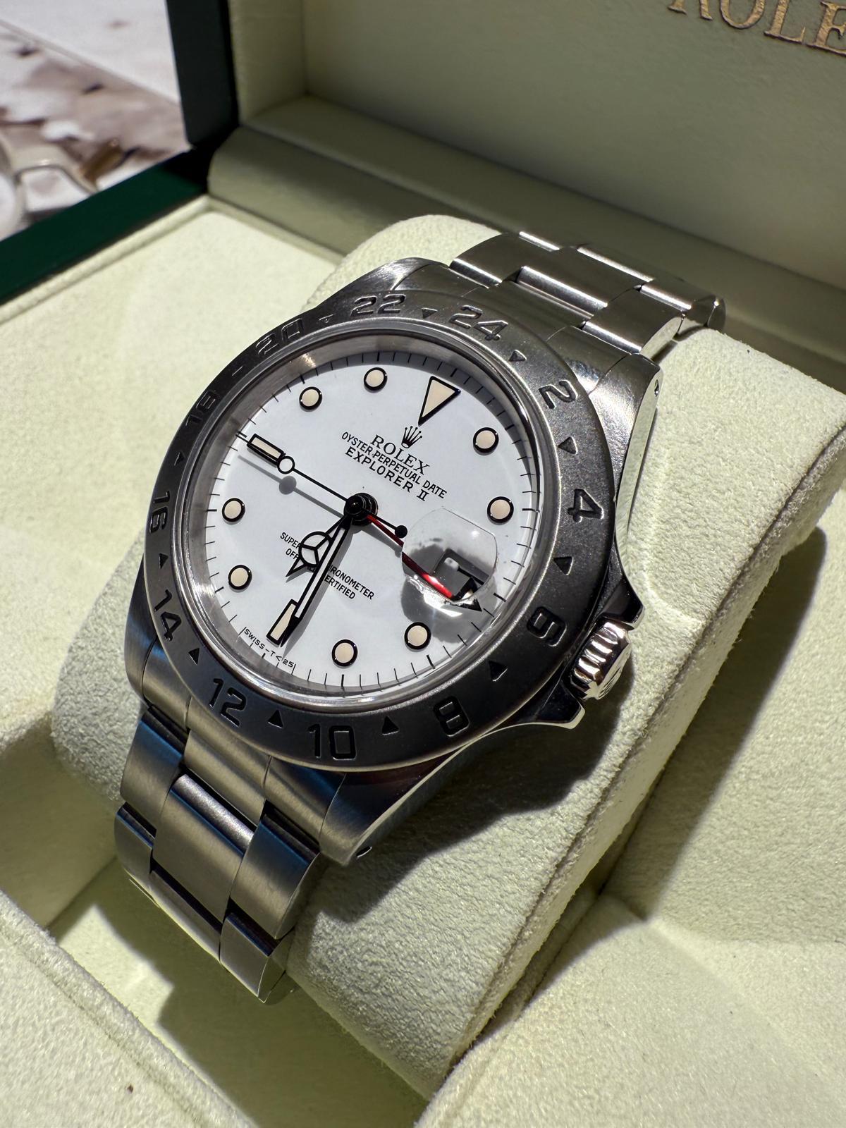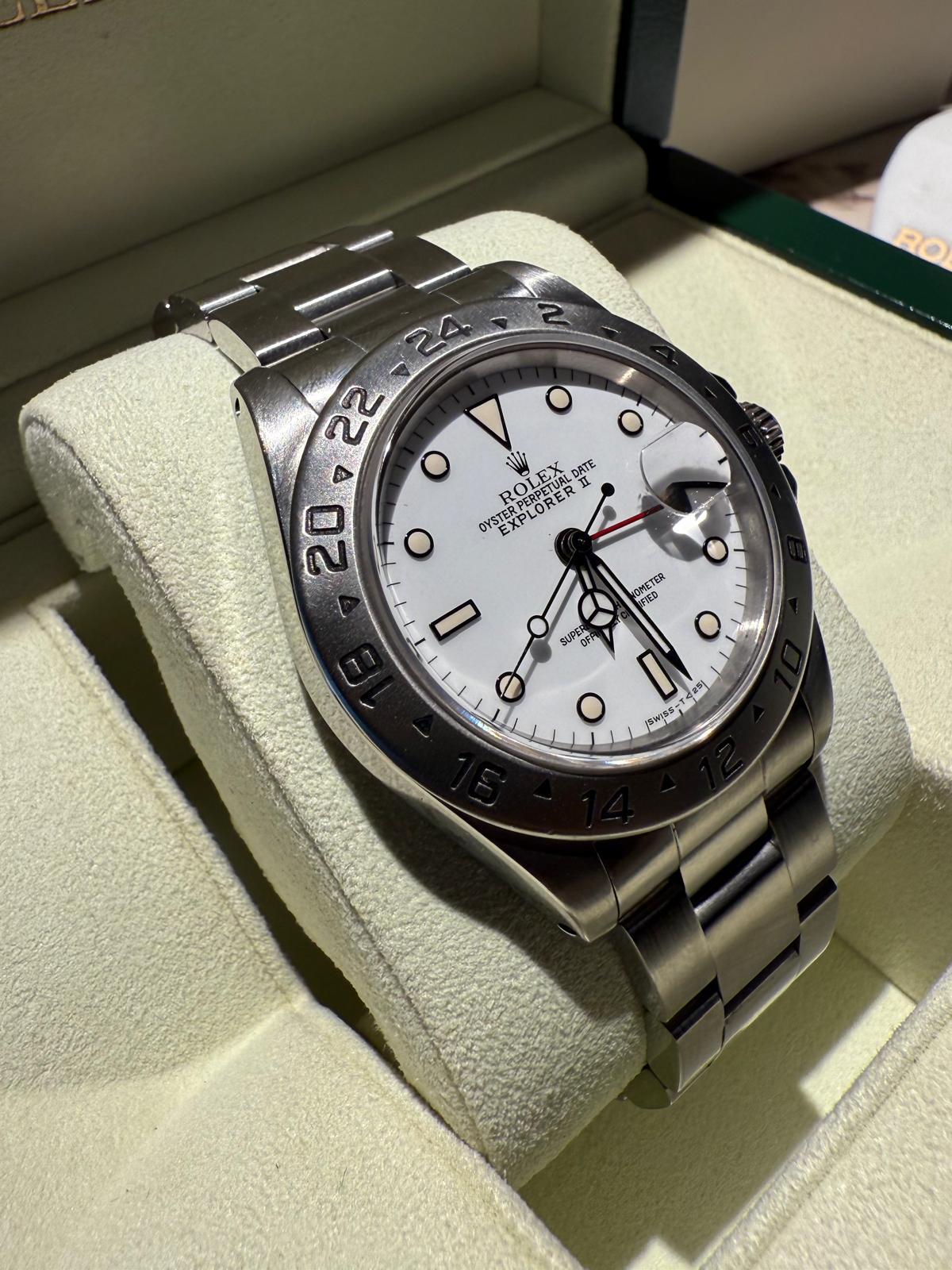 Marca Rolex Modello (Orologio) Explorer II Numero di referenza 16570 Carica Automatico Materiale della cassa Acciaio Materiale cinturino Acciaio Corredo documenti originali Rolex, no box Calibro Carica Automatico Materiale della cassa Acciaio Diametro 40 mm Anno 1990/91 Impermeabile 10 ATM Materiale lunetta Acciaio Vetro Vetro zaffiro Quadrante bianco Numeri sul quadrante Senza numeri Cinturino Materiale cinturino Acciaio Colore cinturino Acciaio Chiusura Déployante Materiale chiusura Acciaio