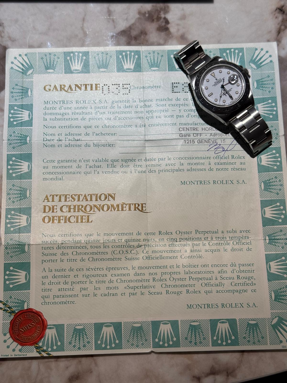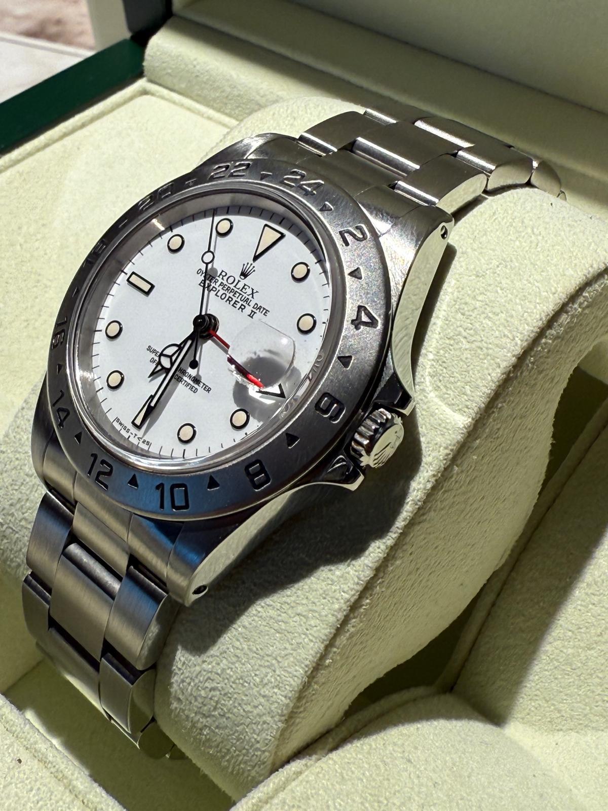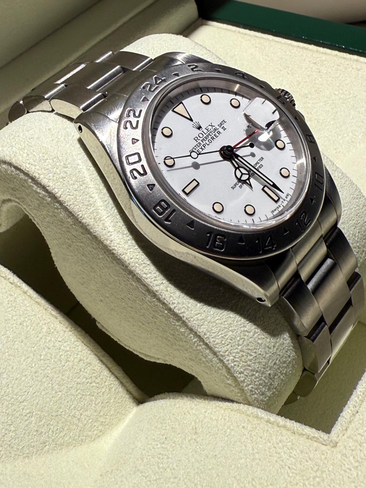 Marca Rolex Modello (Orologio) Explorer II Numero di referenza 16570 Carica Automatico Materiale della cassa Acciaio Materiale cinturino Acciaio Corredo documenti originali Rolex, no box Calibro Carica Automatico Materiale della cassa Acciaio Diametro 40 mm Anno 1990/91 Impermeabile 10 ATM Materiale lunetta Acciaio Vetro Vetro zaffiro Quadrante bianco Numeri sul quadrante Senza numeri Cinturino Materiale cinturino Acciaio Colore cinturino Acciaio Chiusura Déployante Materiale chiusura Acciaio