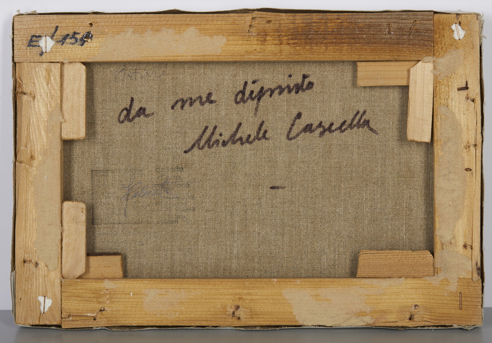 sul retro: firma, dichiarazione di autenticità dell'artista e timbro di provenienza non leggibile