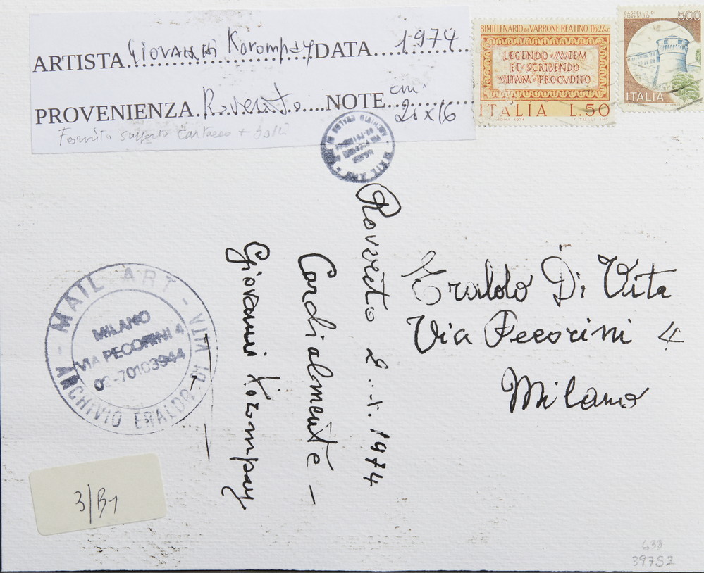 sul retro: firma, data, timbri Mail Art - Archivio Eraldo di Vita, Milano, etichetta descrittiva e timbro Castello di Rovereto