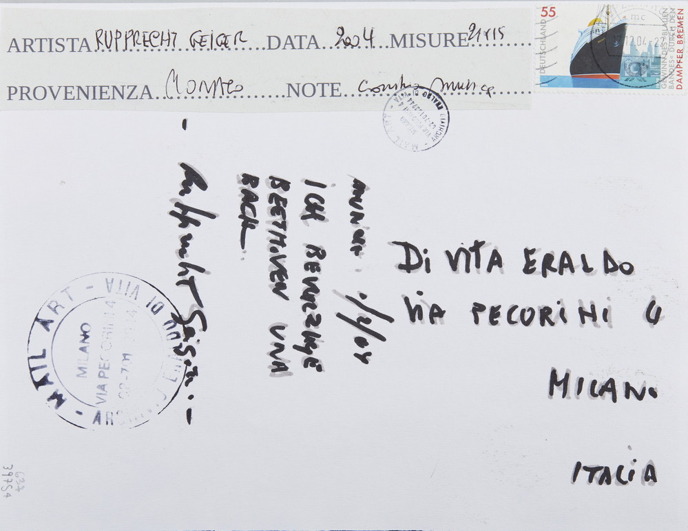 GEIGER RUPPRECHT (1908 - 2009) ICH BEVORZUGE BEETHOVEN UND BACH. 2004. tecnica mista su base litografica. Cm 16,00 x 21,00. sul retro: firma, data, titolo, doppio timbro Mail Art - Archivio Eraldo di Vita, Milano, targhetta descrittiva dell'opera, francobollo e timbro Dampfer Bremen
