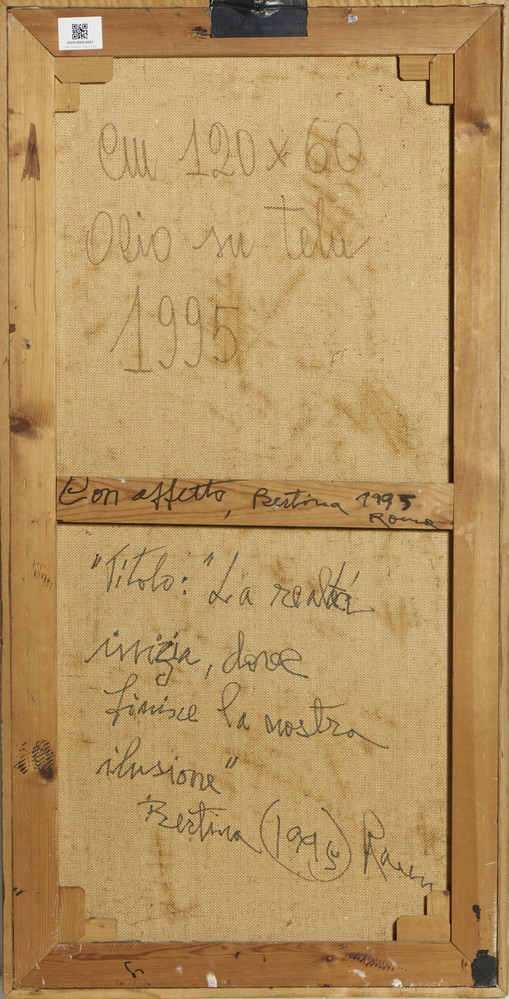 LOPES BERTINA (1924 - 2012) LA REALTÀ INIZIA, DOVE FINISCE LA NOSTRA ILUSIONE. 1995. Olio su tela. Cm 60,00 x 120,00. firma, data e dedica ad personam