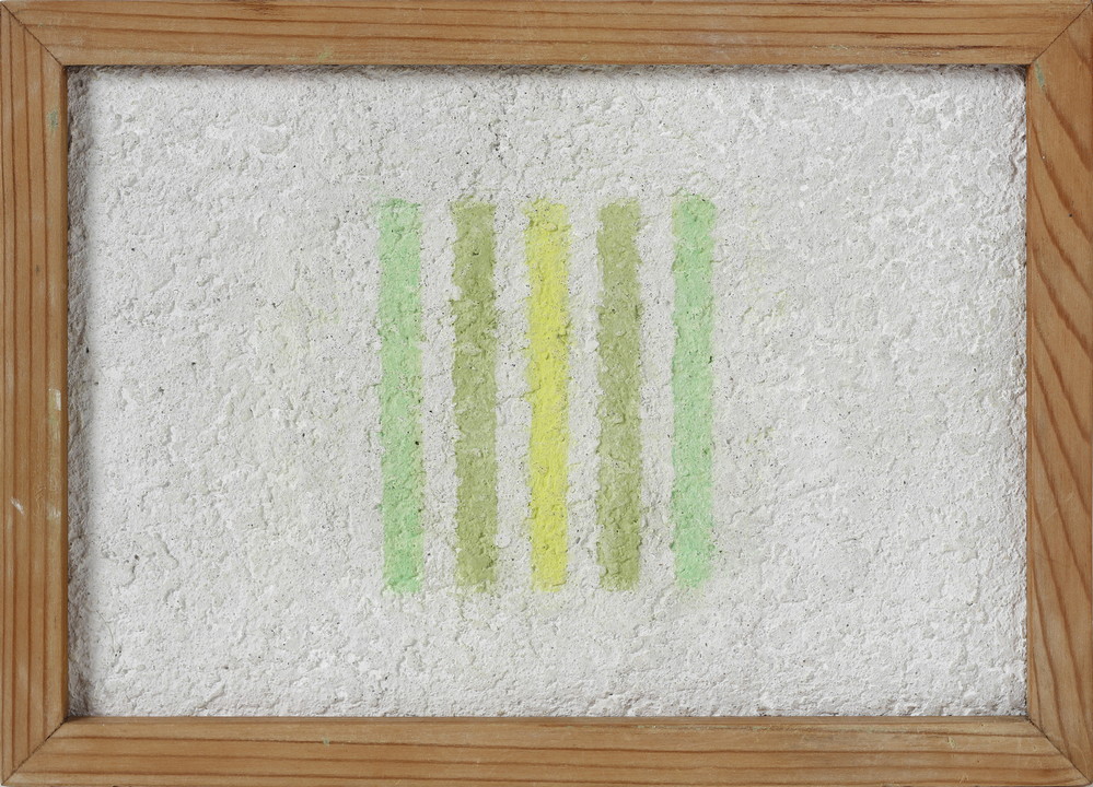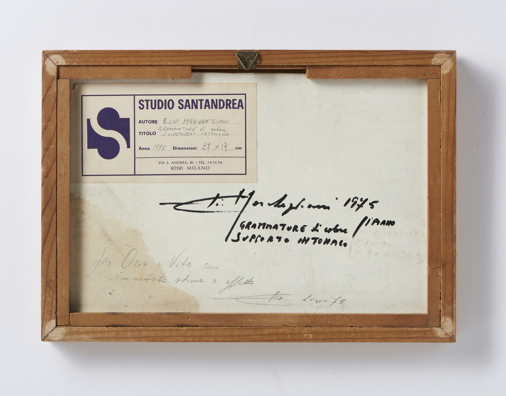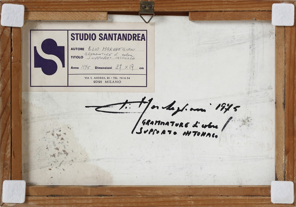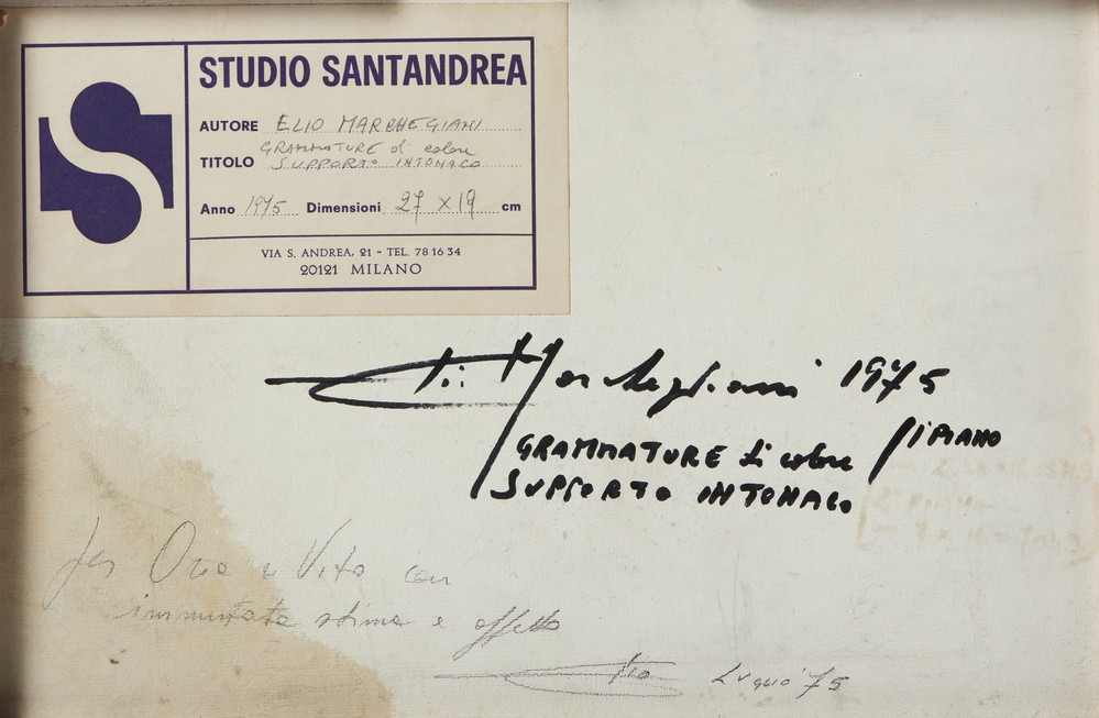 MARCHEGIANI ELIO (n. 1929) GRAMMATURE DI COLORE SUPPORTO INTONACO. 1975. pigmento su intonaco. Cm 27,00 x 19,00. sul retro: firma, titolo, data, dedica ad personam ed etichetta Studio Santandrea, Milano