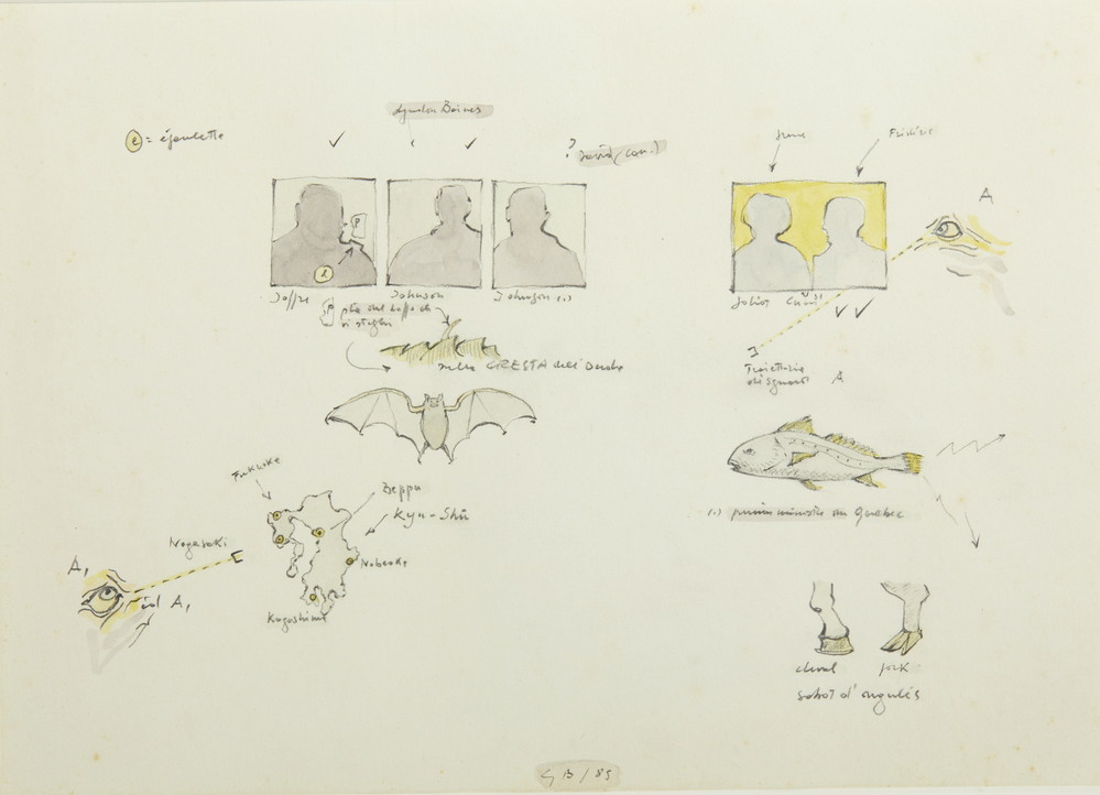BARUCHELLO GIANFRANCO (1924 - 2023) TRAIETTORIA DI SGUARDI. 1985. colori ad acqua, matita su carta. Cm 24,00 x 18,00. sul retro: firma, data e dedica ad personam