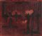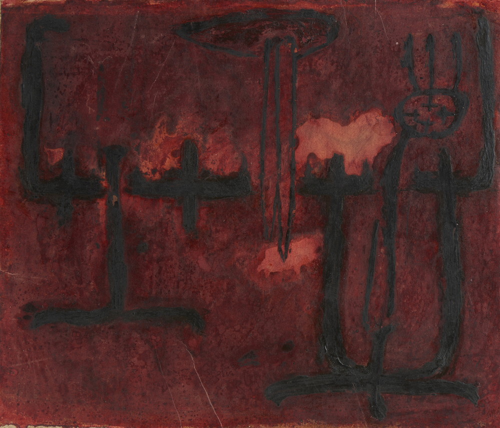 TIRELLI MARCO (n. 1956) OMINO E PAESAGGIO . 1982. tecnica mista su carta applicata su tela. Cm 34,00 x 29,00. sul retro: firma e anno
