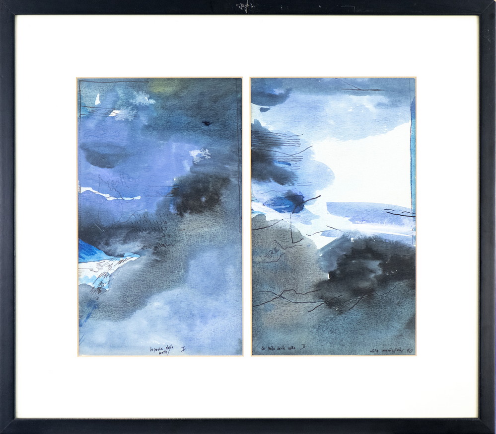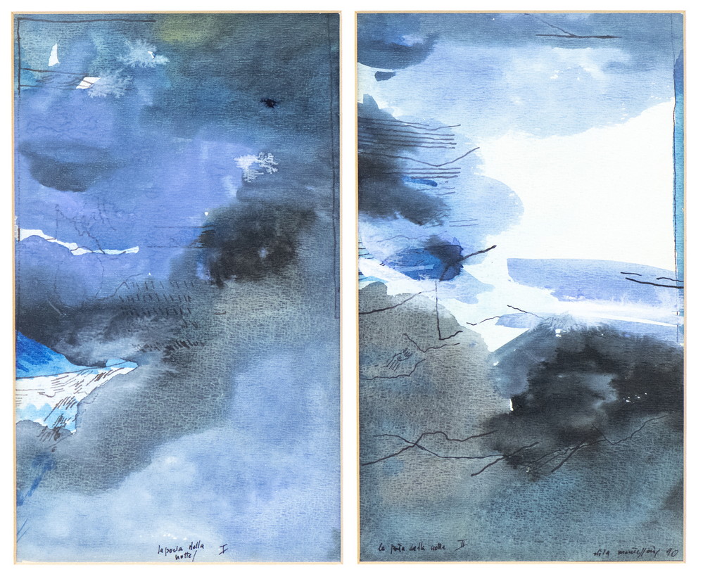 MONTESSORI ELISA (n. 1931) DITTICO: LA PORTA DELLA NOTTE I, LA PORTA DELLA NOTTE II. 1990. acquarello su carta. Cm 36,70 x 30,00. titolo, firma e data. Cornice presente