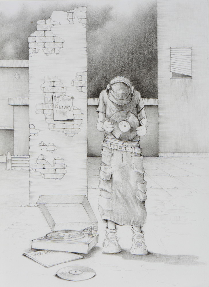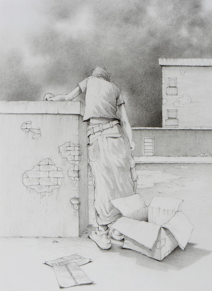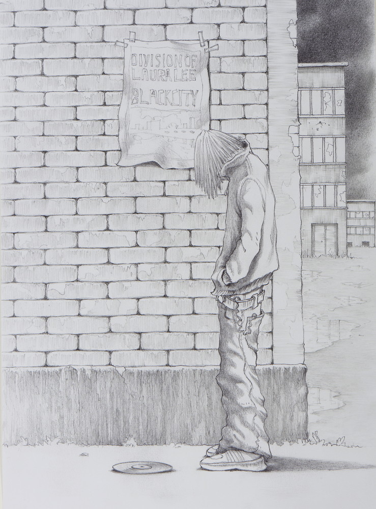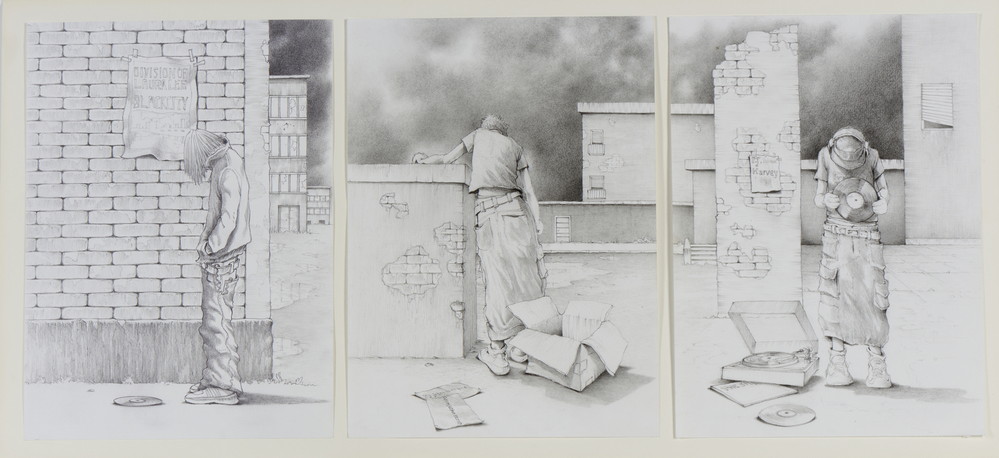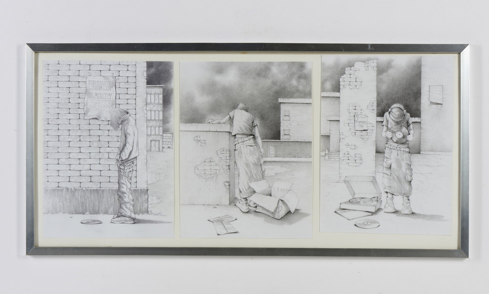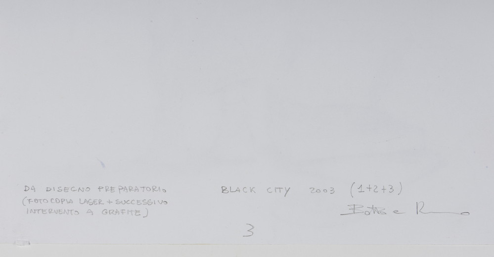 BOTTO & BRUNO DA DISEGNO PREPARATORIO BLACK CITY. 2003. fotocopia laser con intervento a grafite. Cm 36,00 x 76,00. sul retro firma, data e titolo.