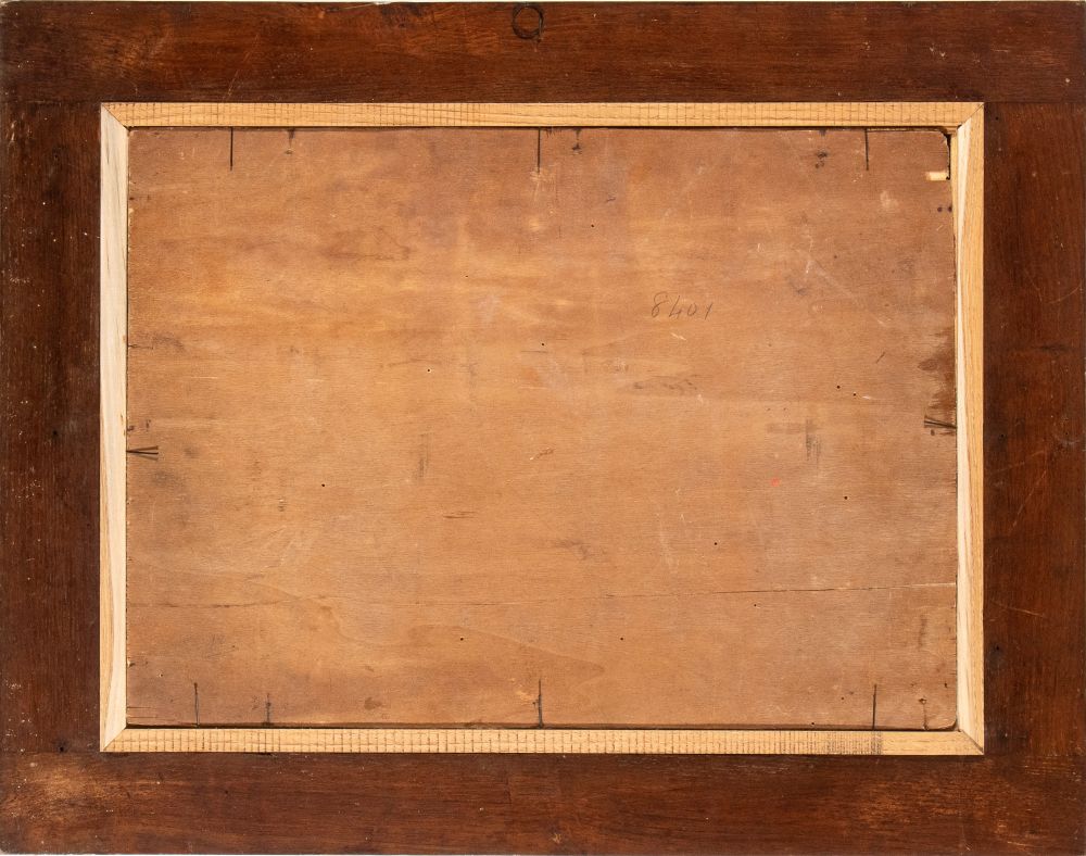 Buone condizioni, cornice senza vetro. Presenza di due fenditure della tavola in basso a sinistra e in alto a destra