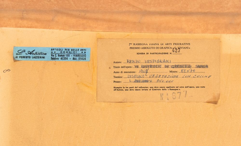 Firmato e datato in basso a destra: Vespignani, 67. Al retro etichetta della VII Rassegna Pisana di arti figurative, Premio assoluto di grafica G. Viviani