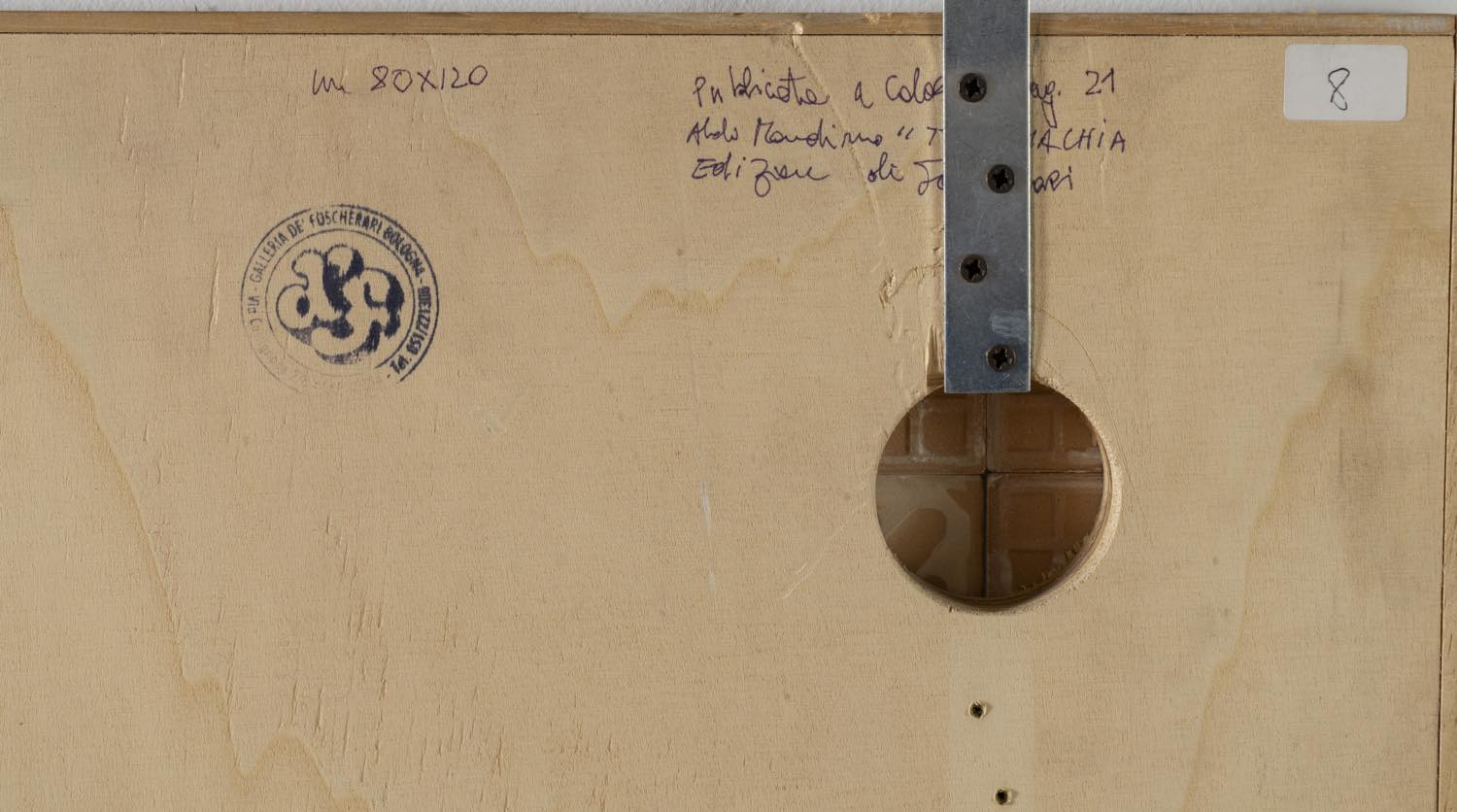 Ceramica con intervento su pannello di legno, al retro reca titolo, firma, data, timbro della Galleria De Foscherari, H cm 80x120