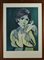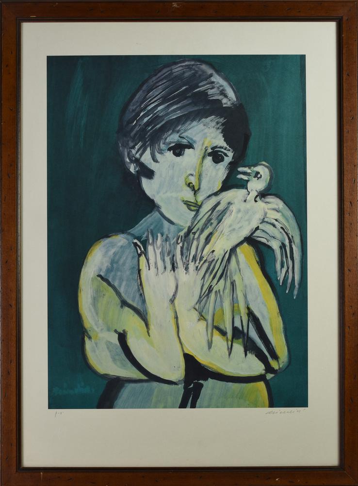 Remo Brindisi FIGURA CON COLOMBA stampa su carta, cm 70x50; es. p.a. firma e...