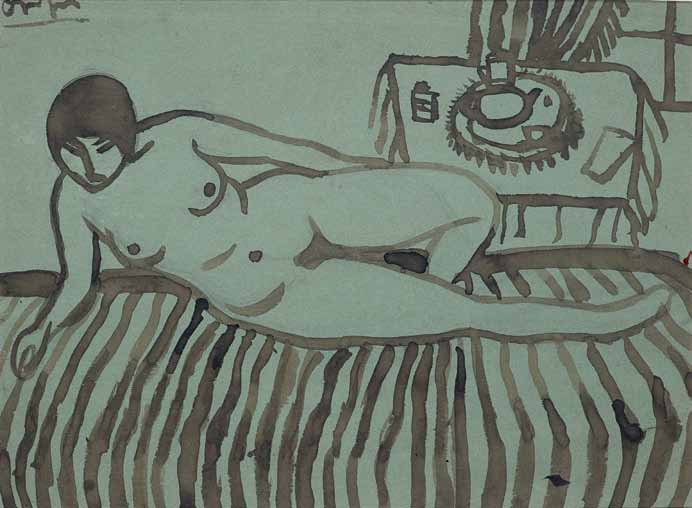 UBALDO OPPI Bologna 1889 – Vicenza 1942 Il the, 1912-13 inchiostro su carta azzurra, cm 22x29. Firmato in alto a sinistra: Oppi Esposizioni: Venezia, Ala Napoleonica e Museo Correr, Gli Anni di Ca’ Pesaro, 19 dicembre 1987 – 27 febbraio 1988 (etichetta al verso). Bibliografia: Venezia, Gli Anni di Ca’ Pesaro 1908-1920, catalogo della mostra, Ed. Mazzotta, Milano 1987, n. 9, pagina 179 (riprodotto b/n).