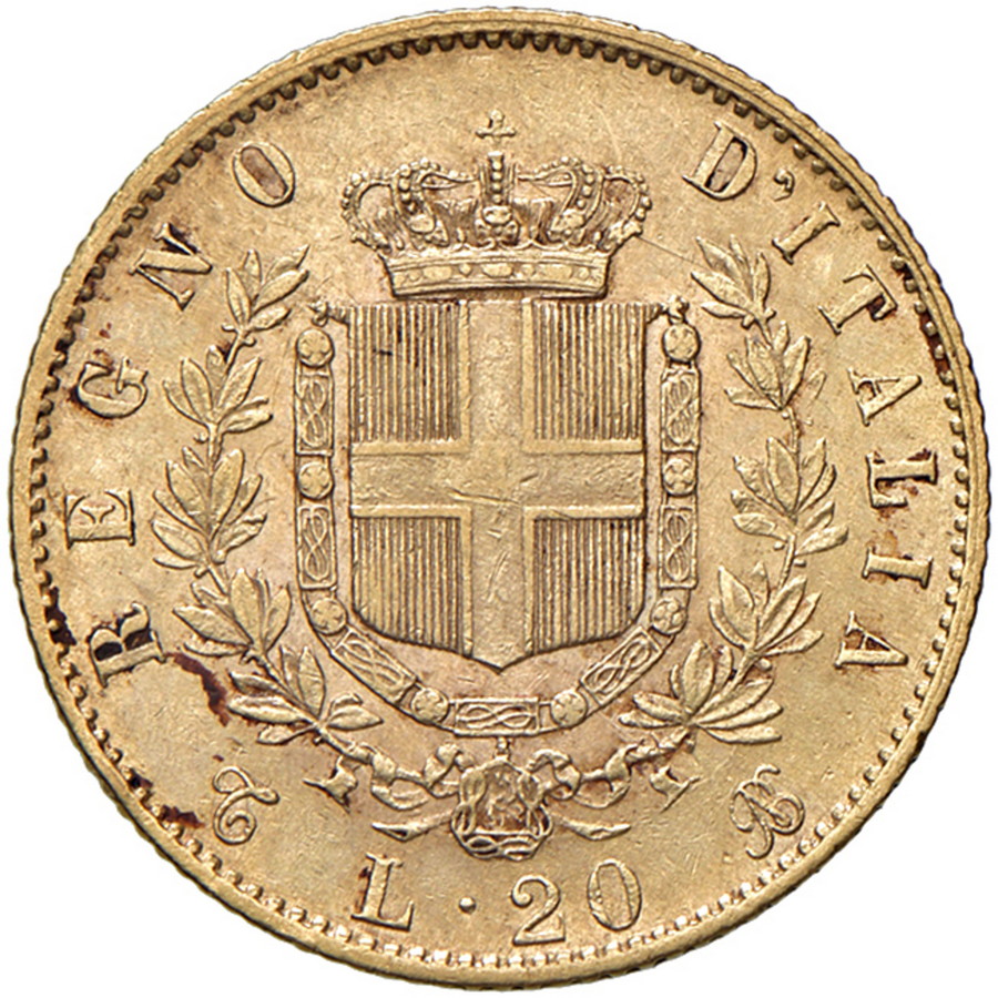 VITTORIO EMANUELE II, RE D'ITALIA (1861-1878), 20 LIRE, 1866, BB/SPL. 1866. . . Vittorio Emanuele II, Re d'Italia (1861-1878), 20 lire, 1866. Gig. 10. Rara. BB/SPL colpetti. Peso totale: 6,45 g. 5,80 g d'oro.