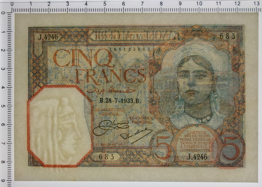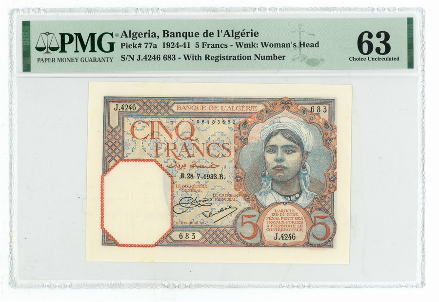 5 FRANCS BANQUE DE L’ALGÉRIE FRENCH ADMINISTRATION 28/07/1933 qFDS. . . Descrizione: Biglietto non circolato, certificato “63” PMG (choice Uncirculated)