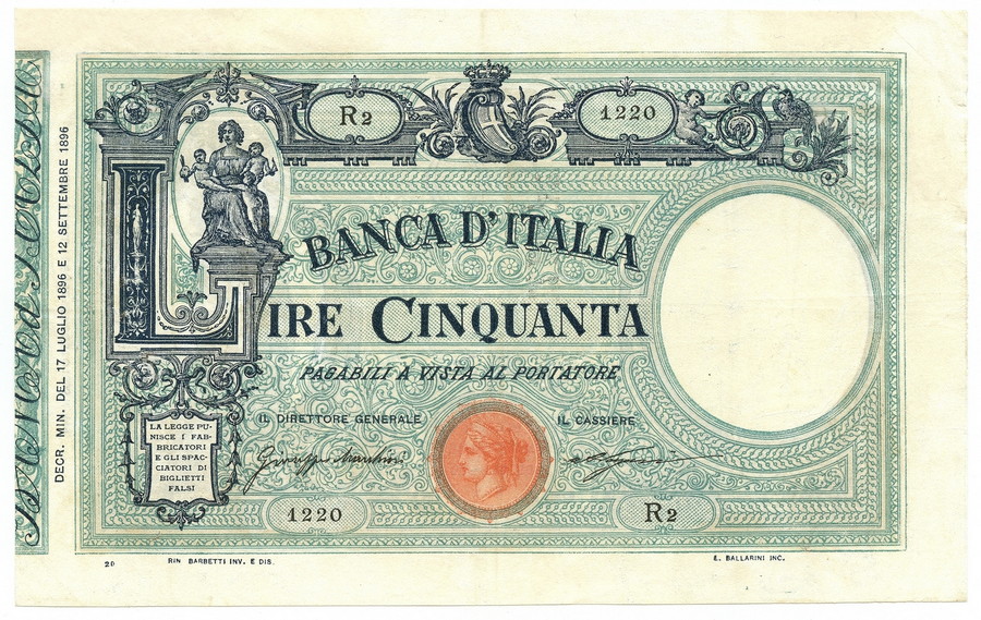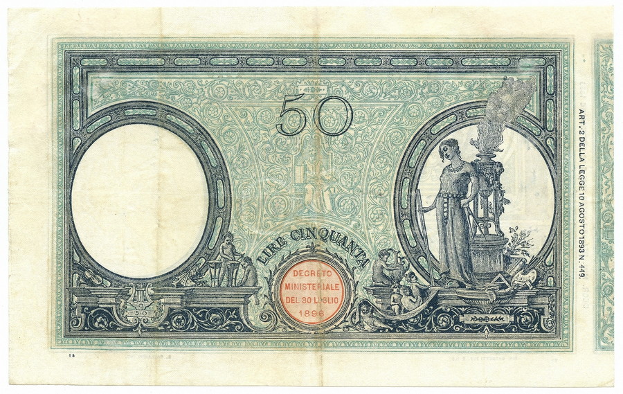 - 50 LIRE BARBETTI GRANDE L MATRICE LATERALE REGNO UMBERTO I 12/09/1896 MB.