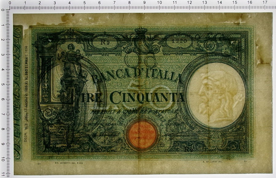 50 LIRE BARBETTI GRANDE L MATRICE LATERALE REGNO UMBERTO I 12/09/1896 MB. . . RIPARAZIONI AI BORDI