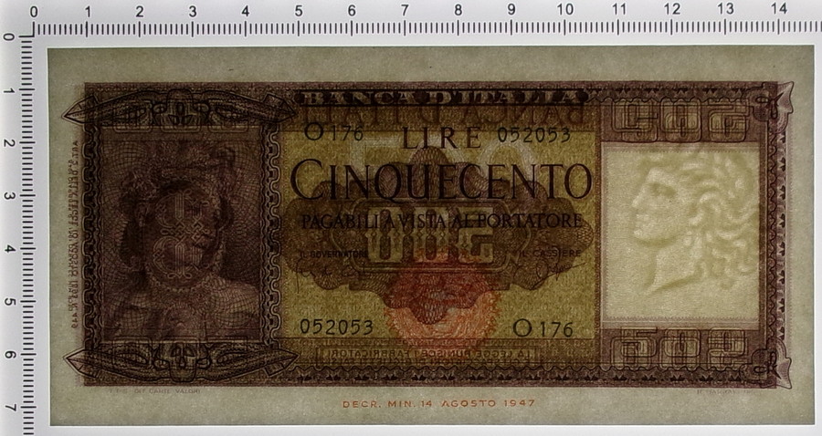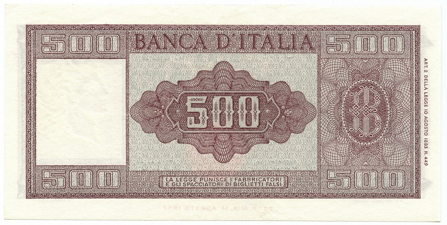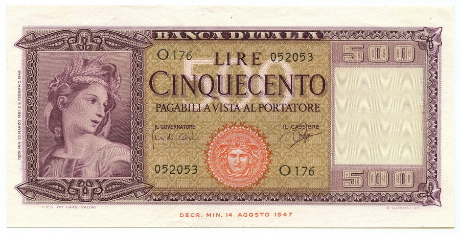 500 LIRE BANCA D'ITALIA ORNATA DI SPIGHE MEDUSA 23/03/1961 SPL+. . . Seriale O176 052053.