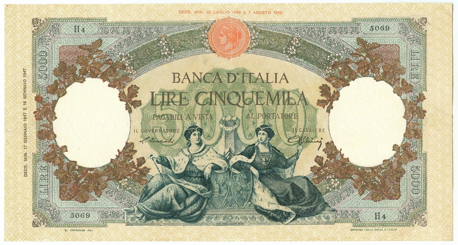 - 5000 LIRE CAPRANESI REPUBBLICHE MARINARE REGINE DEL MARE TESTINA 17/01/1947 MB+.