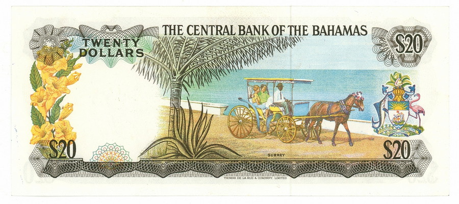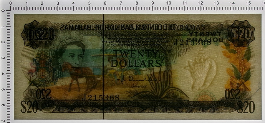 20 DOLLARS CENTRAL BANK OF THE BAHAMAS 1974 SPL. . . Descrizione: Unghiate sparse e tracce di inchiostro in basso a destra.