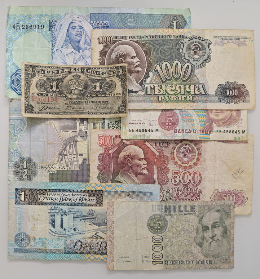 LOTTO 8 BANCONOTE MONDIALI E 4 MONETE ITALIANE D'EPOCA. . . Lotto composto da 8 banconote mondiali e 4 monete italiane tra cui: