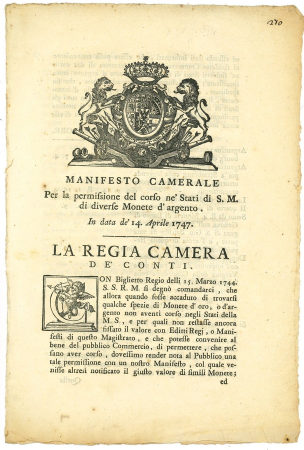 - 1747 - MANIFESTO CAMERALE MONETE ARGENTO REGNO DI SARDEGNA (4 PAG.).