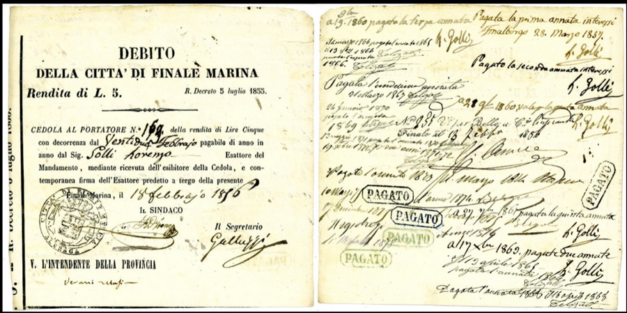 1855 - DEBITO DELLA CITTA' DI FINALE MARINA - 1 OBBLIGAZIONE. . .