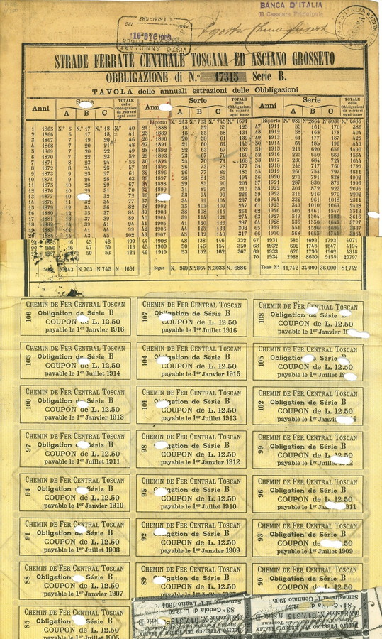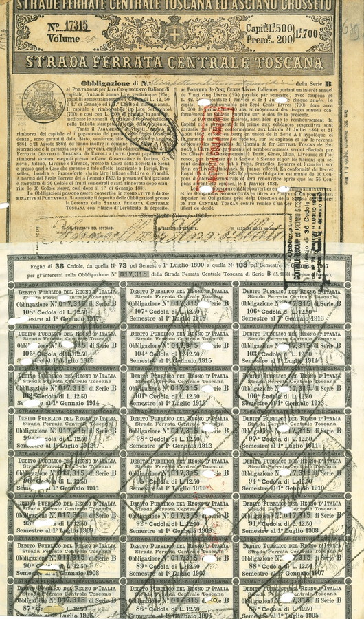 - 1863 - STRADA FERRATA CENTRALE TOSCANA - 1 OBBLIG. SERIE B SIENA.