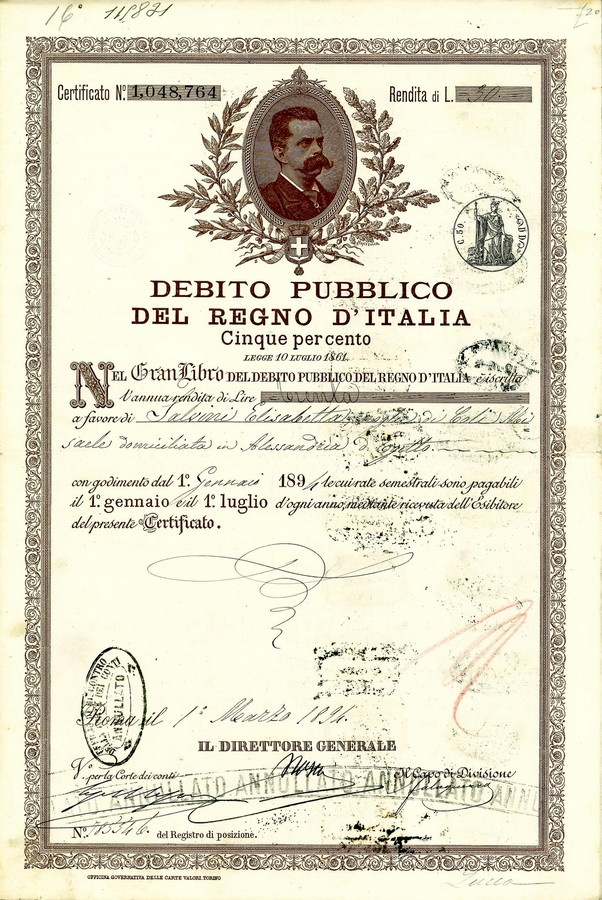 - 1901 - DEBITO PUBBLICO REGNO D'ITALIA UMBERTO I 5% RENDITA LIRE 125 - ROMA.