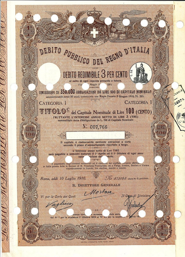 - 1910 - TITOLO DA LIRE 100 REDIMIBILE 3% DEB. PUBB. REGNO D'ITALIA - ROMA.