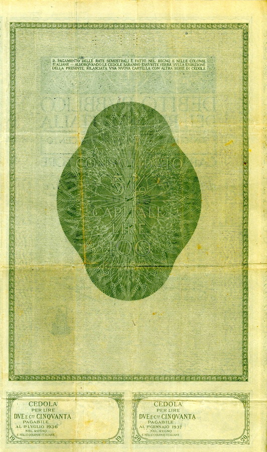 1926 - CARTELLA 100 LIRE - D.PUBBLICO CONSOLIDATO 5% REGNO D'ITALIA. . .