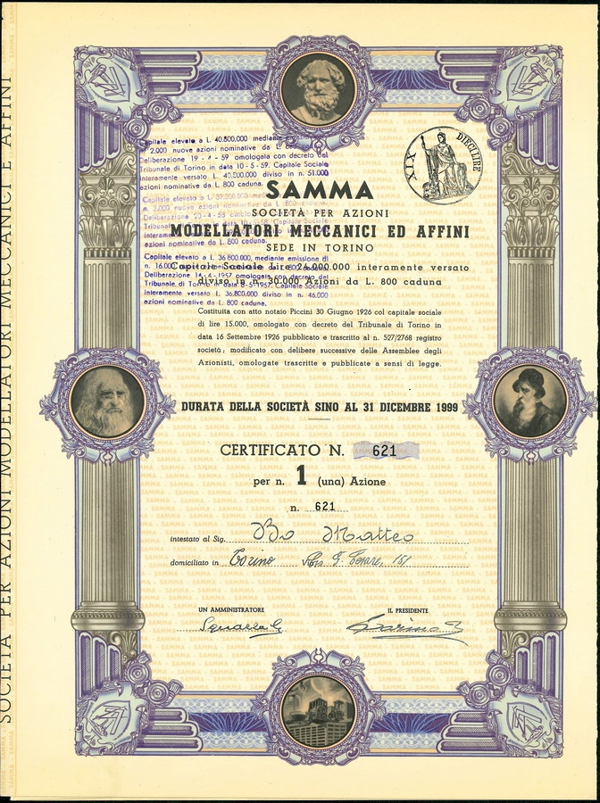 1926 - SAMMA MODELLATORI MECCANICI ED AFFINI 1 AZIONE - TORINO. . .