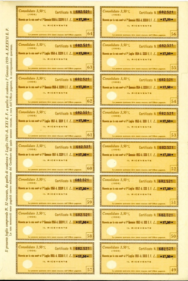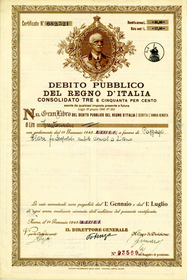 - 1943 - CONSOLIDATO 3,5% DEBITO PUBBLICO REGNO D'ITALIA - ROMA.