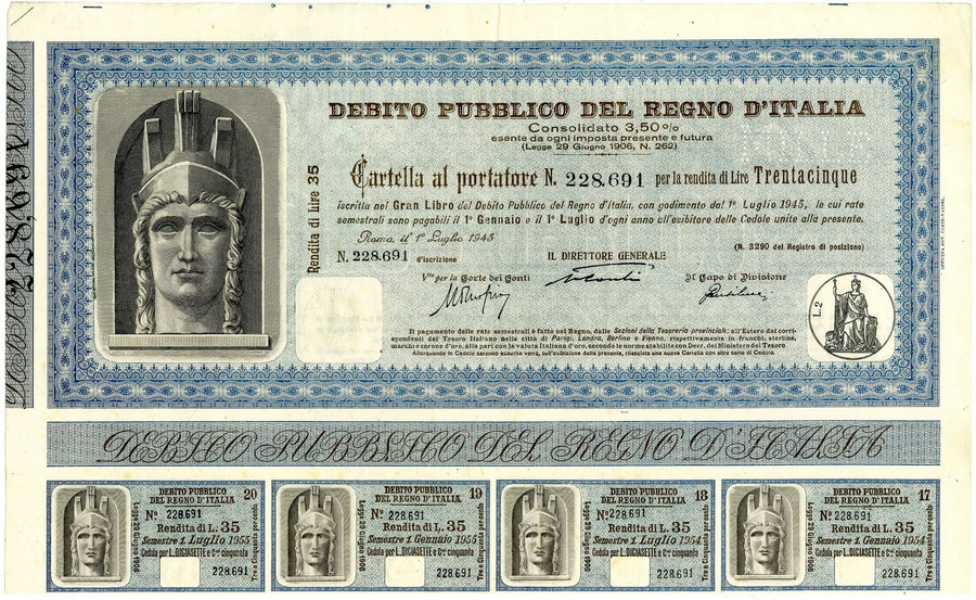 - 1945 - CONSOLIDATO 3,5% LIRE 1.000 DEBITO PUBBLICO REGNO D'ITALIA - NON ANNULLATO - ROMA.