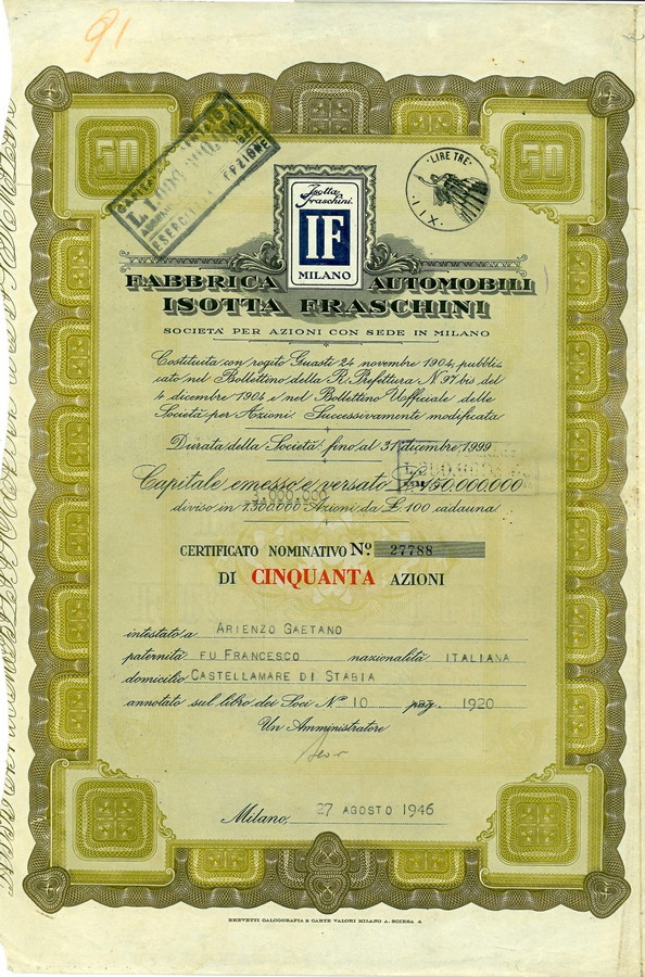 - 1946 - FABBRICA AUTOMOBILI ISOTTA FRASCHINI - 50 AZIONI - MILANO.