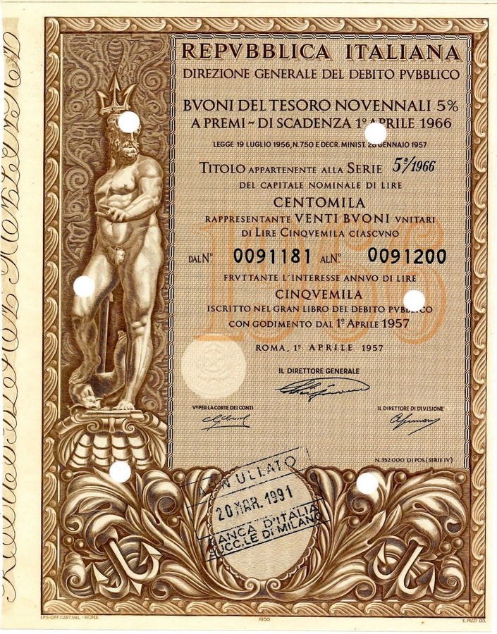 Lotto 371 | - 1957 - BUONI DEL TESORO NOVENNALI 5% - 100.000 LIRE - ROMA (Nettuno con tridente, marrone).