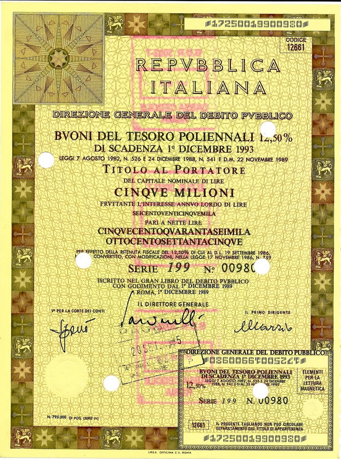- 1989 - BTP POLIENNALI SERIE 199 LIRE 5 MILIONI ROMA (Rosa dei venti - Repubbliche marinare).