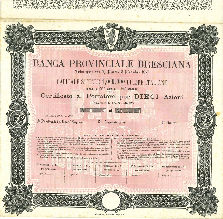 - 1872 - BANCA PROVINCIALE BRESCIANA - 10 AZIONI BRESCIA.