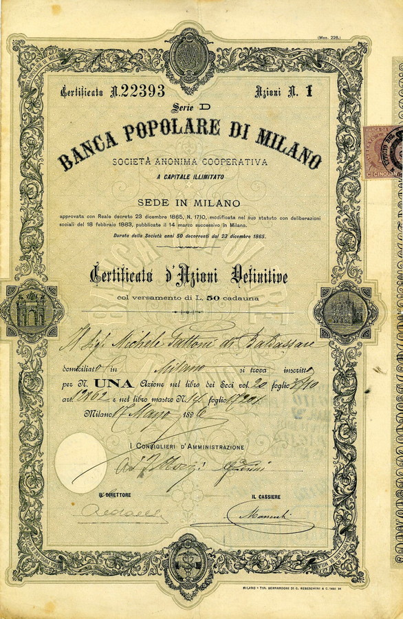 - 1896 - BANCA POPOLARE DI MILANO N. 1 AZIONE DA LIRE 50 - MILANO.